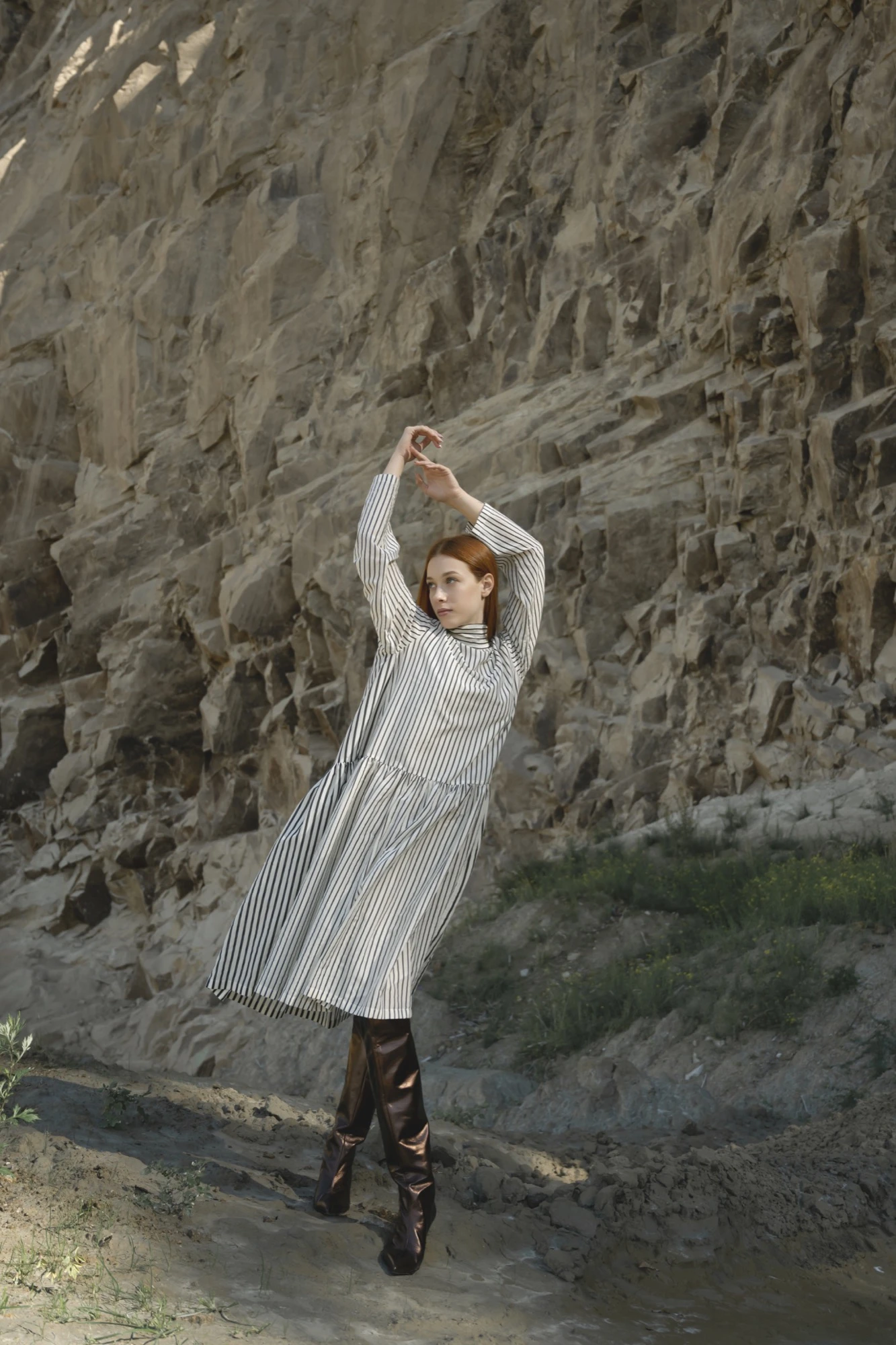 This unique location, with its dramatic rock formations and geological textures, offered the perfect contrast to the refined sartorial choices. The rugged landscape of the quarry, usually hidden from view, provided a minimalist yet powerful stage, allowing each garment to stand out. It’s a testament to our ongoing research and passion for unexpected harmonies: the soft drape of a fabric against the hard lines of the rock; the vibrant colour of an accessory echoed in the subtle hues of the terrain.