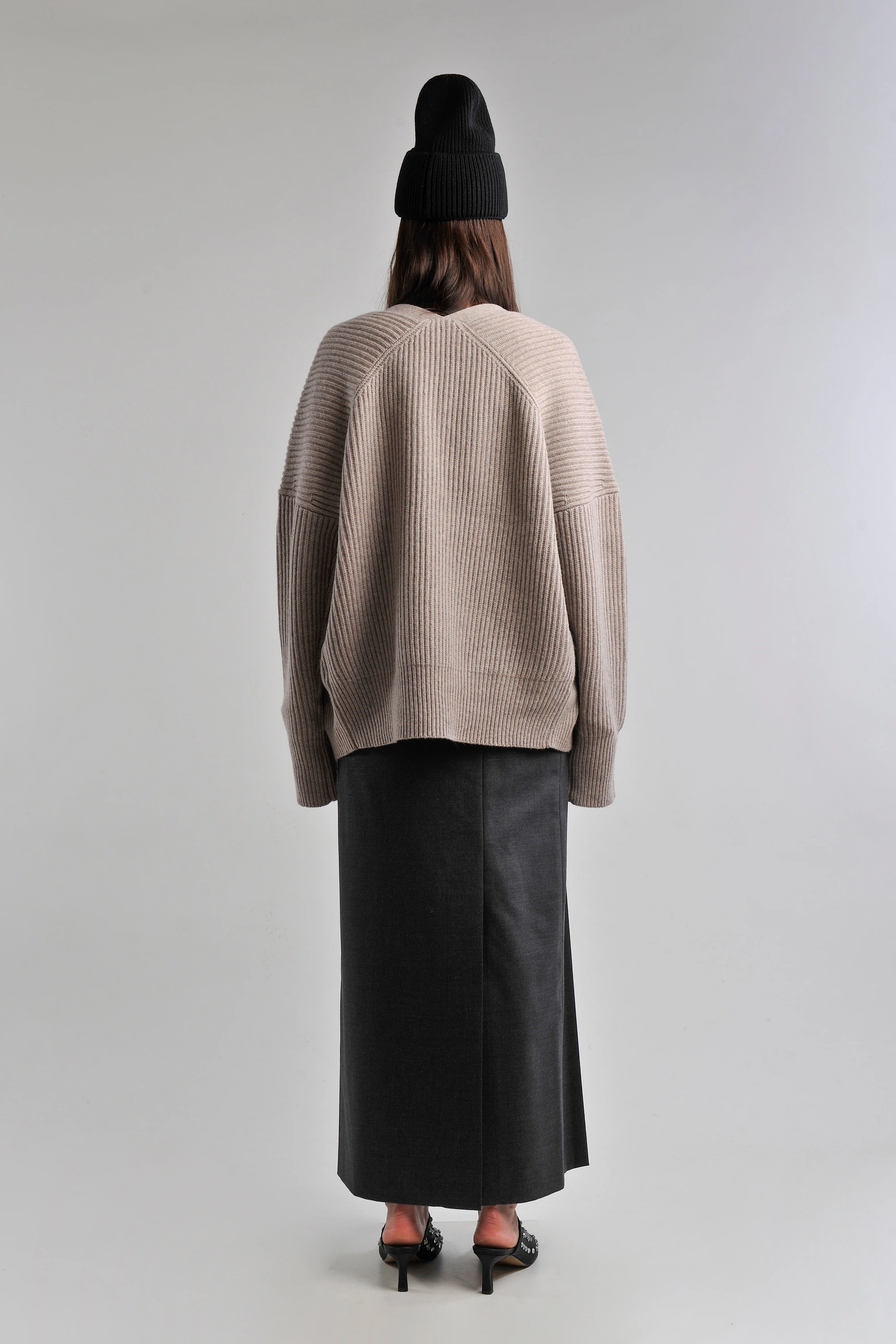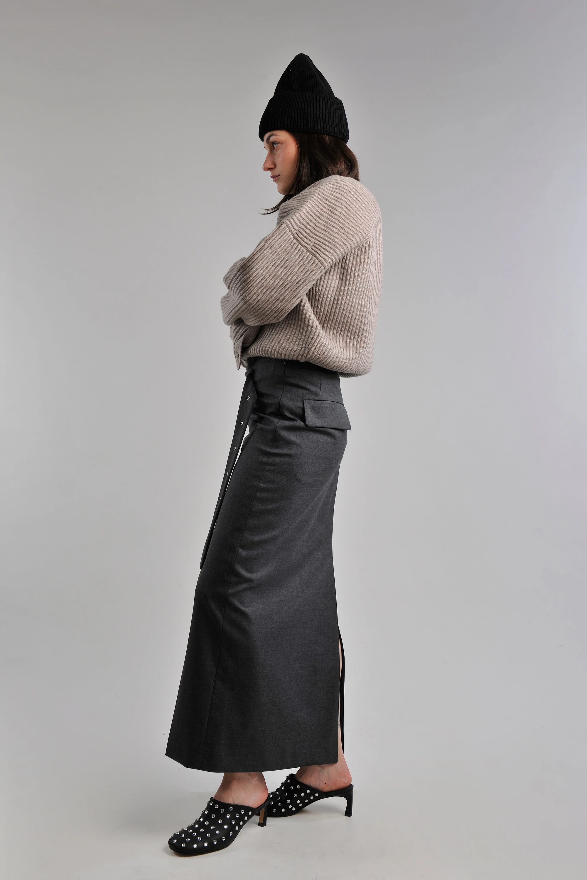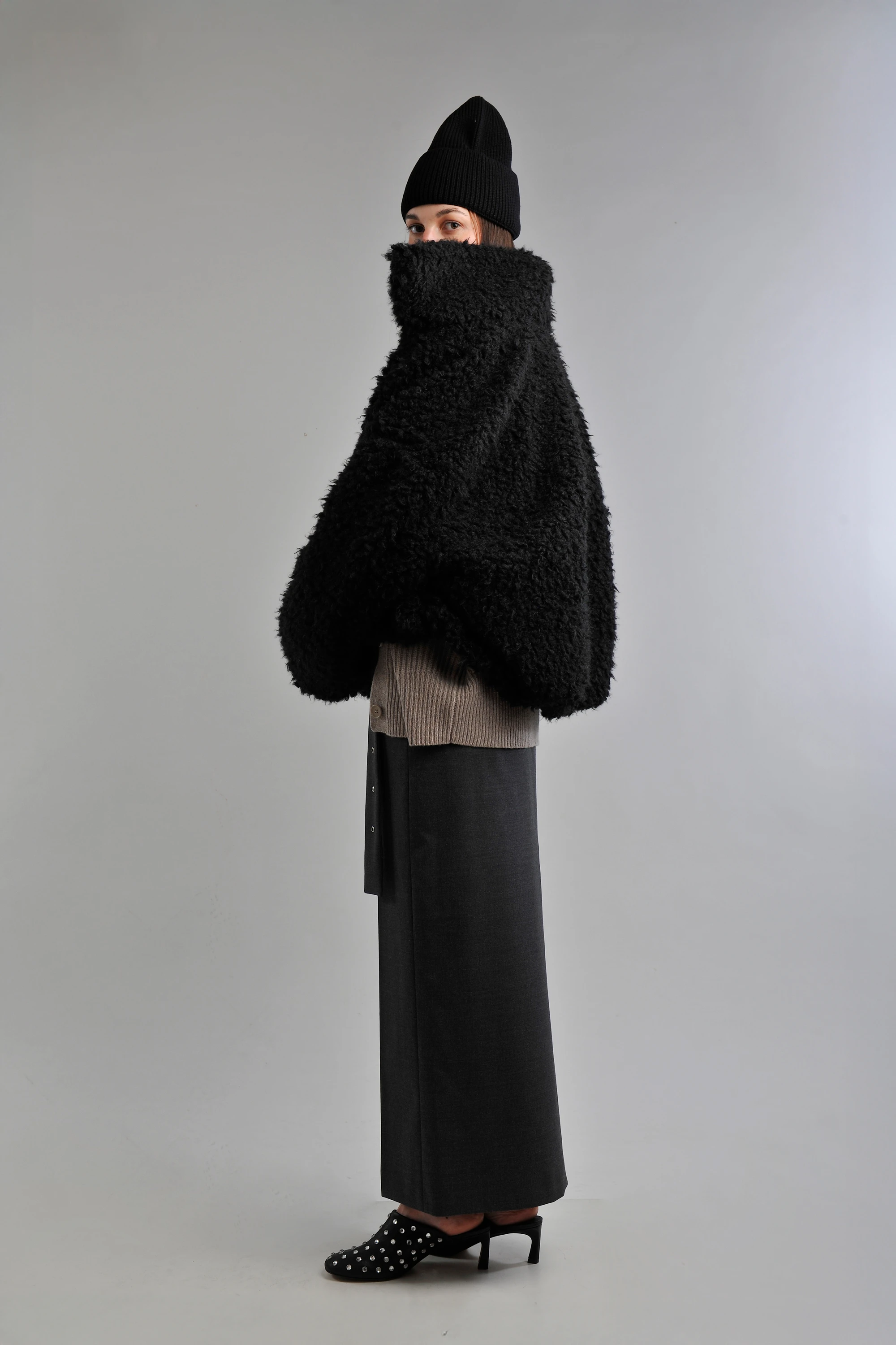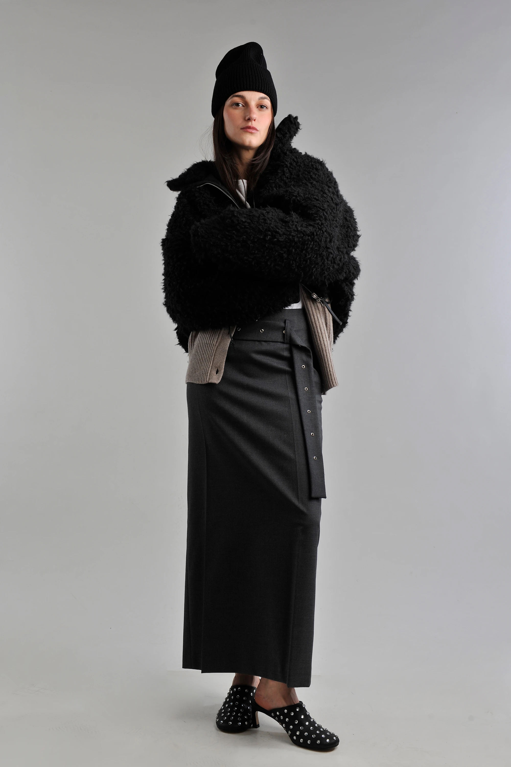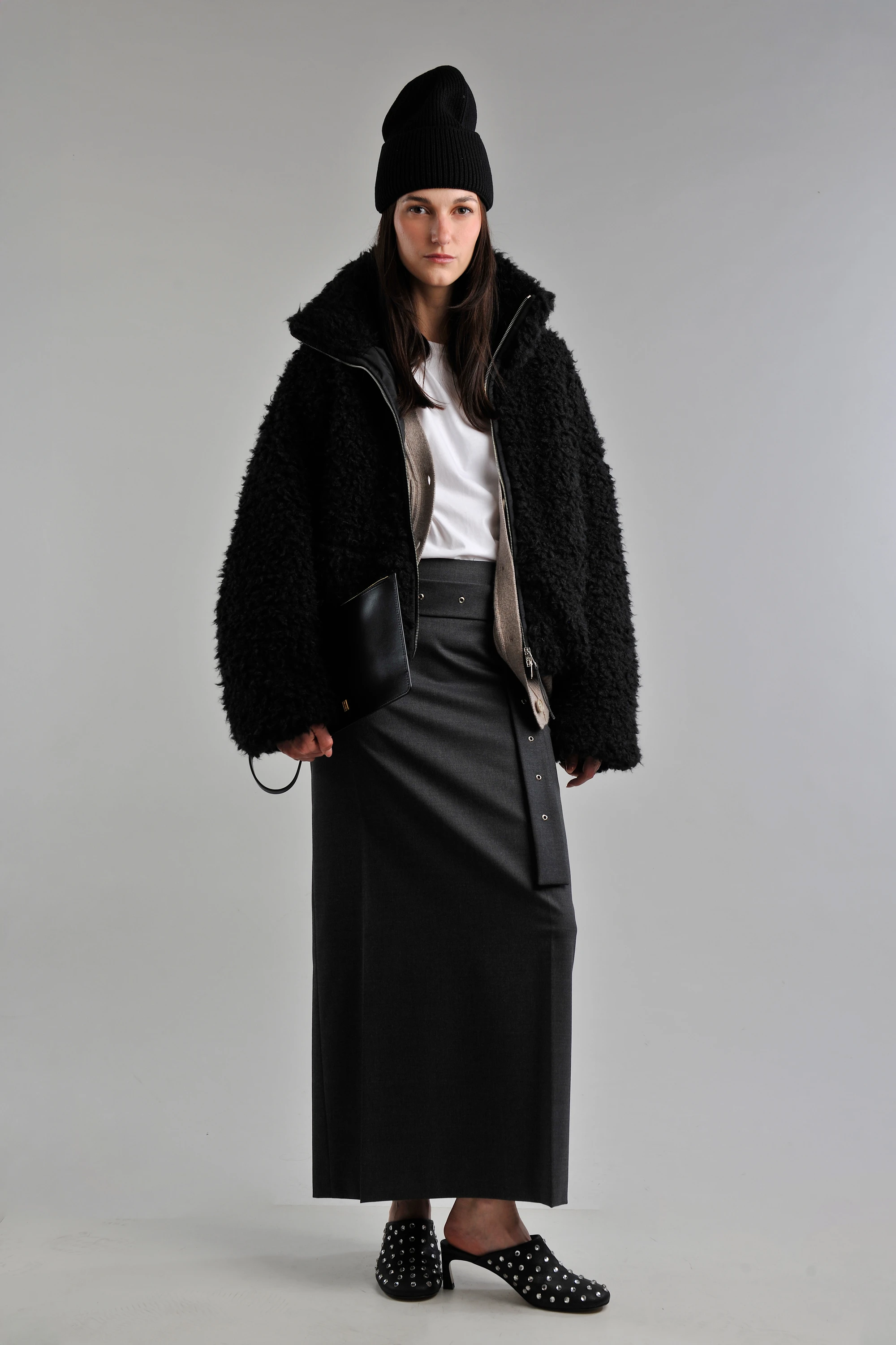 The voluminous TELA teddy bomber creates a striking silhouette, beautifully contrasted by the sleek, elongated lines of the LOW CLASSIC skirt.