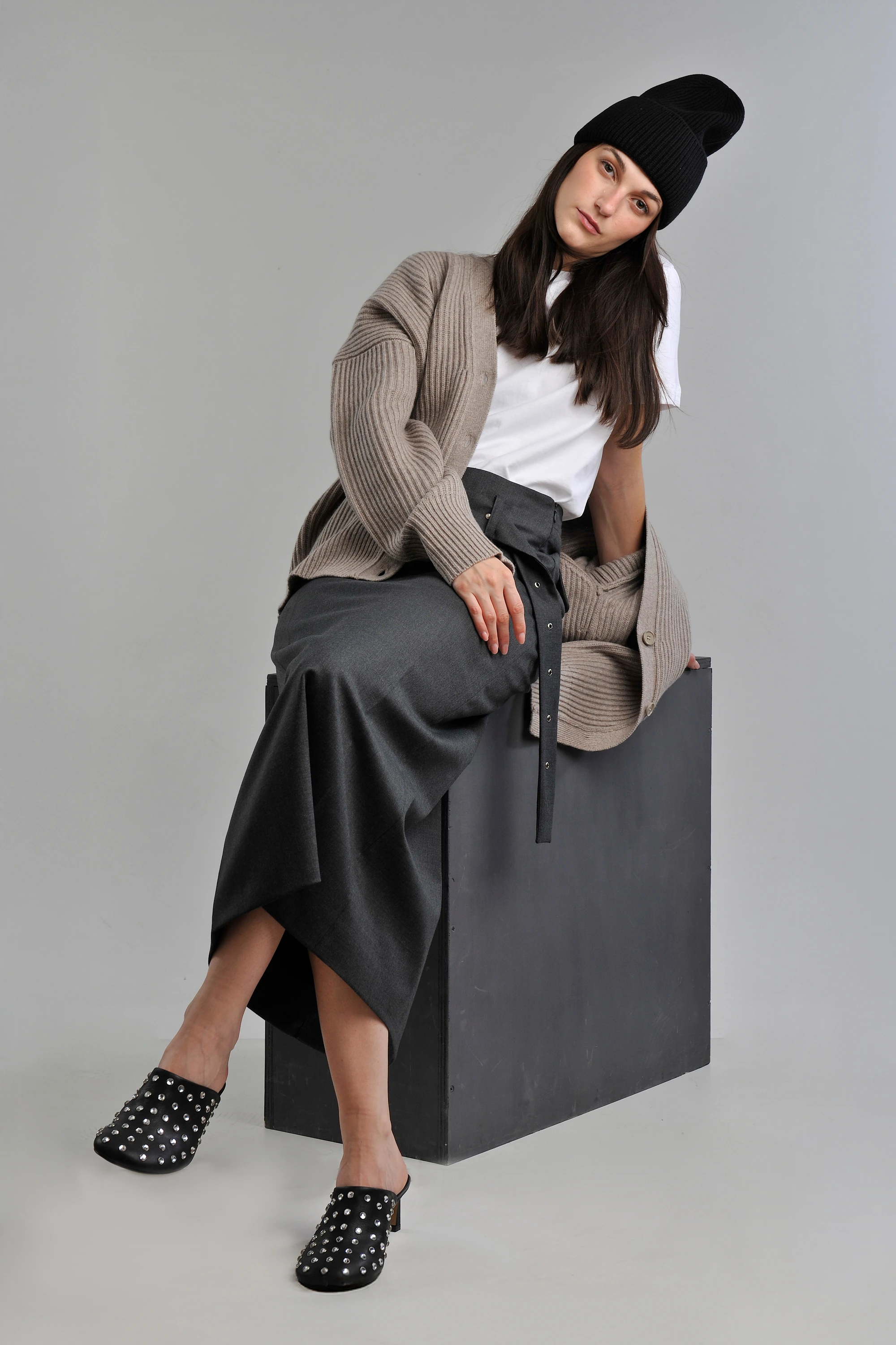 Accessories complete the look with intention: a cozy DESTIN beanie anchors the outfit, while the studded detail on the TELA mules adds an unexpected element of grit and polish.