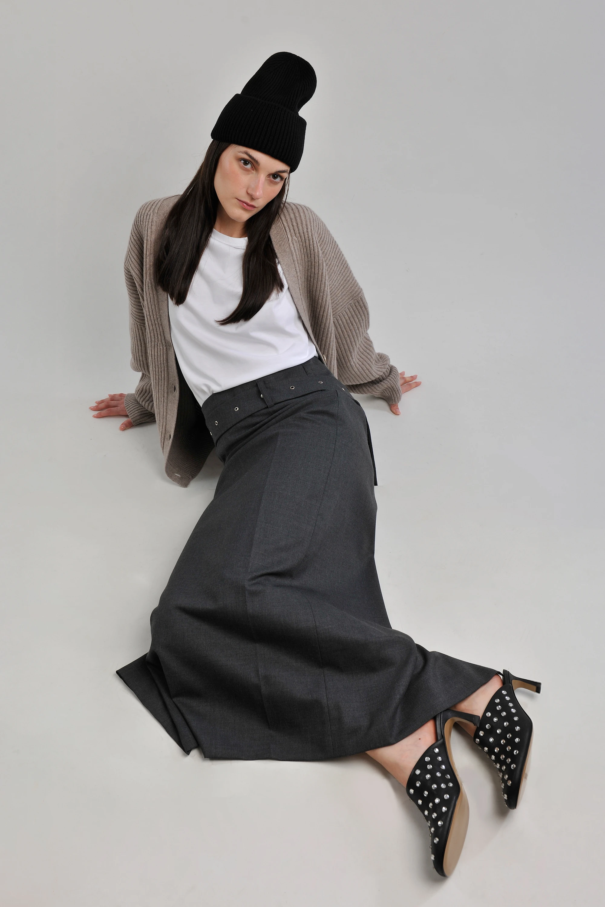 The foundation is built on refined essentials: a HOUSE OF DAGMAR t-shirt layered beneath a CHRISTIAN WIJNANTS cardigan provides subtle warmth and dimension.