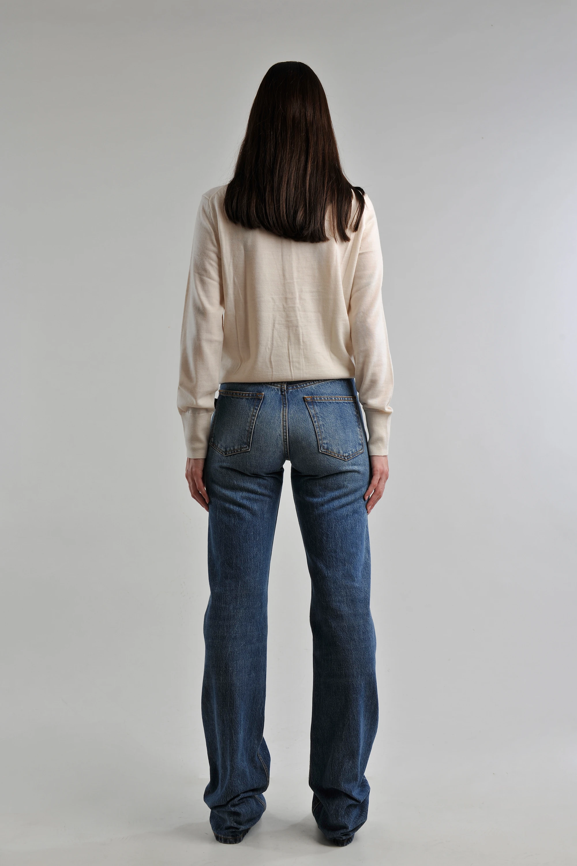 This refined softness is perfectly balanced by the enduring appeal of HAIKURE jeans, whose high-waisted cut and relaxed fit define a modern, effortless silhouette.
