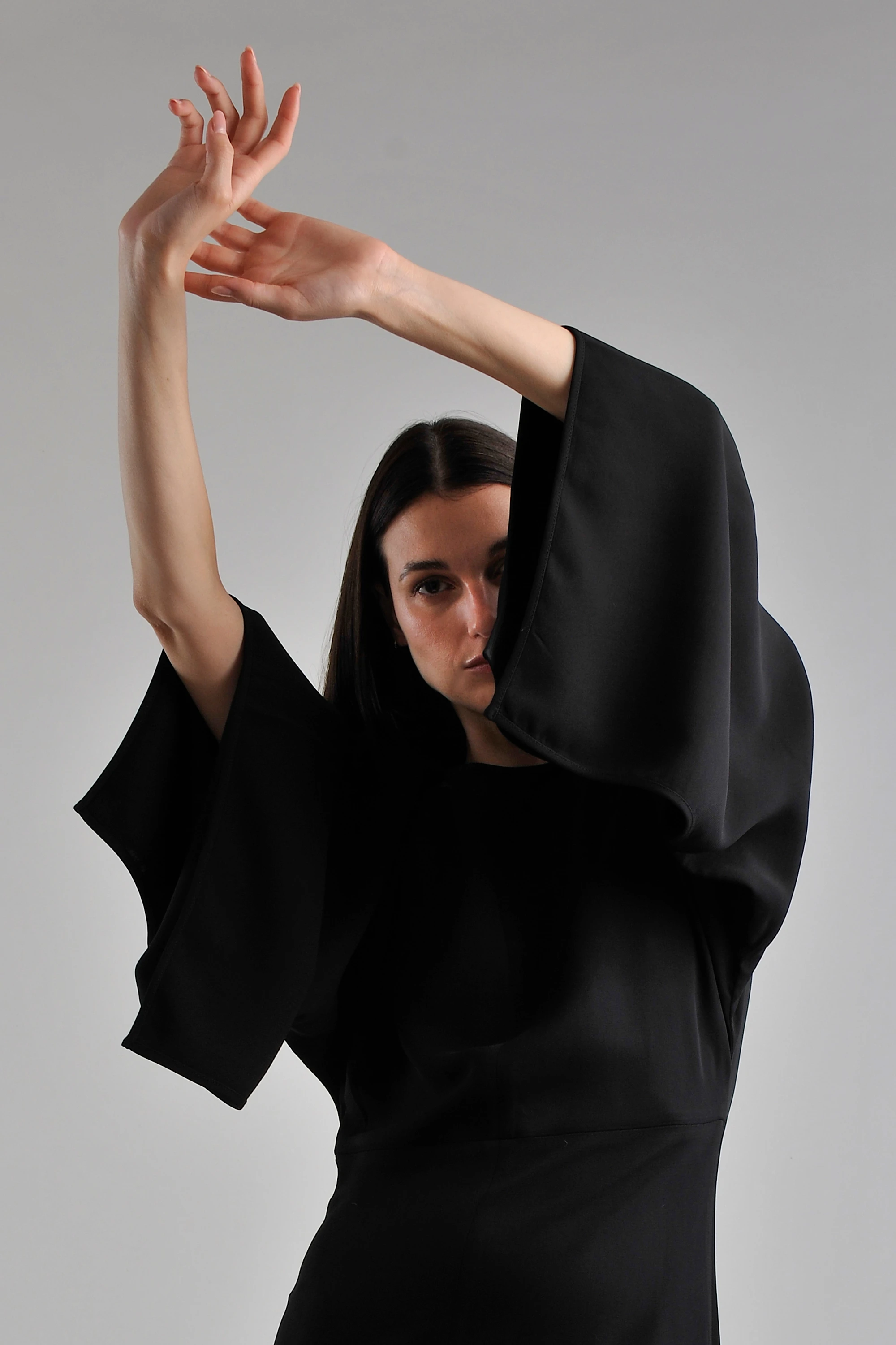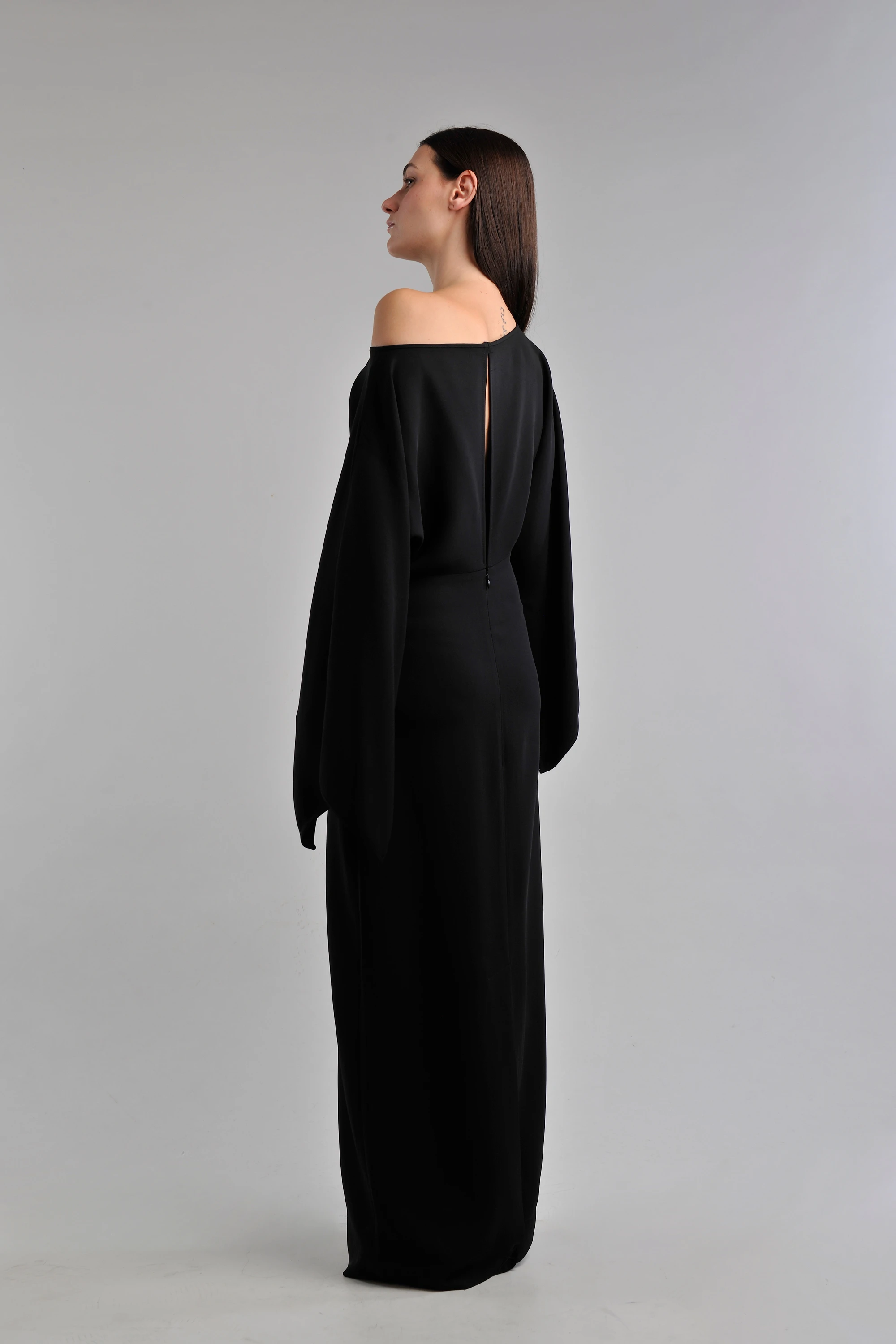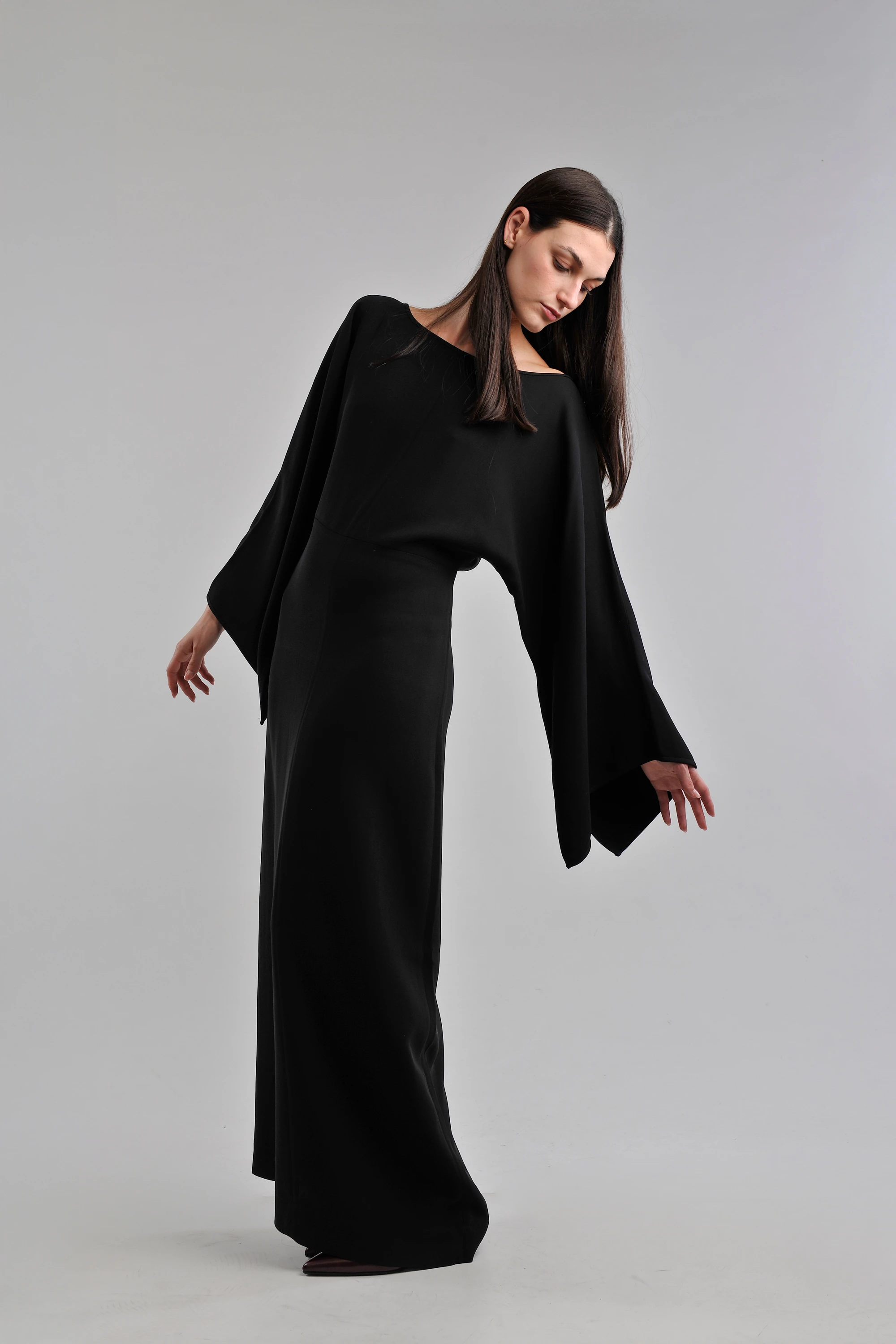 The BY MALENE BIRGER dress commands attention with its floor-sweeping length and architecturally wide sleeves, creating a powerful, fluid silhouette.