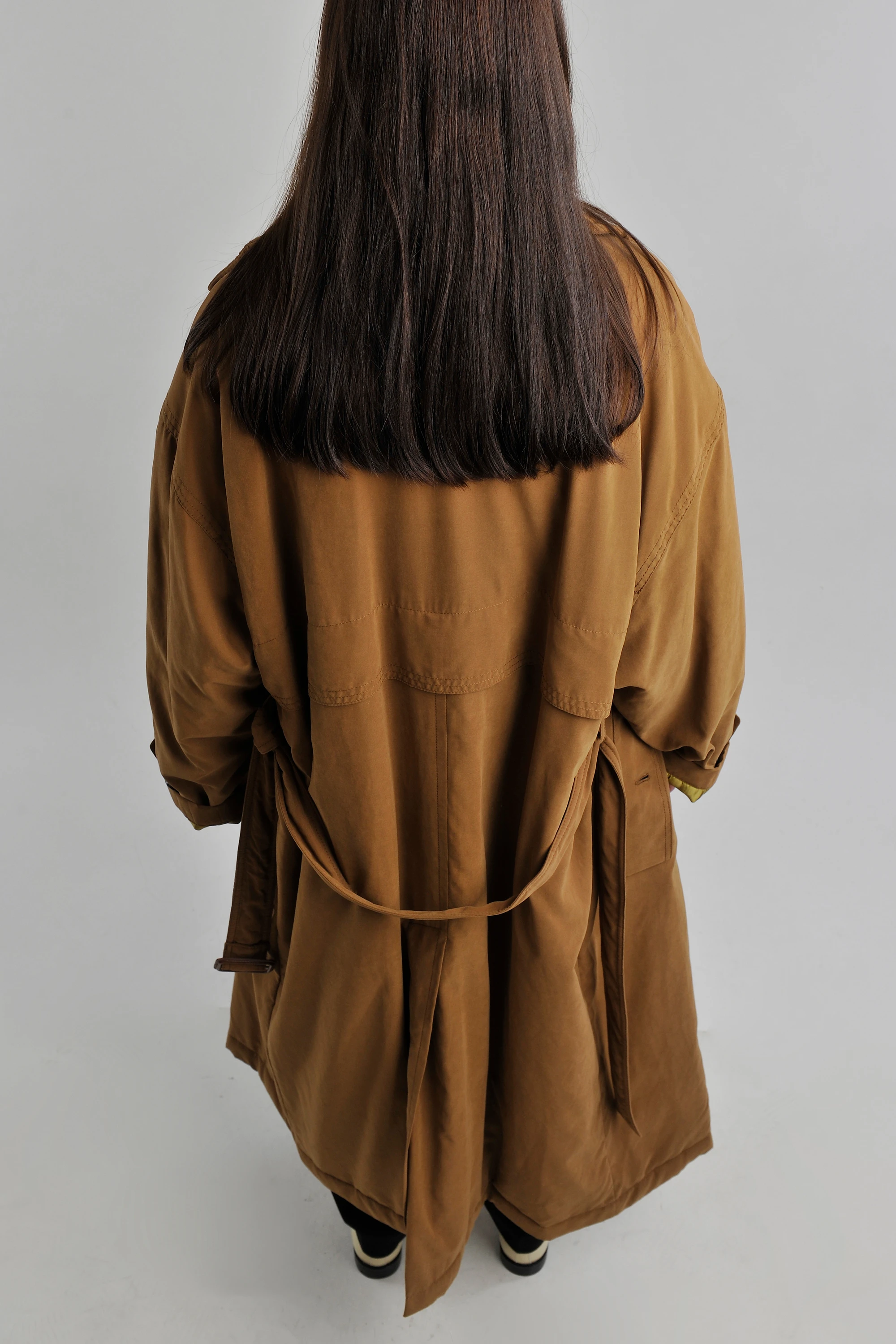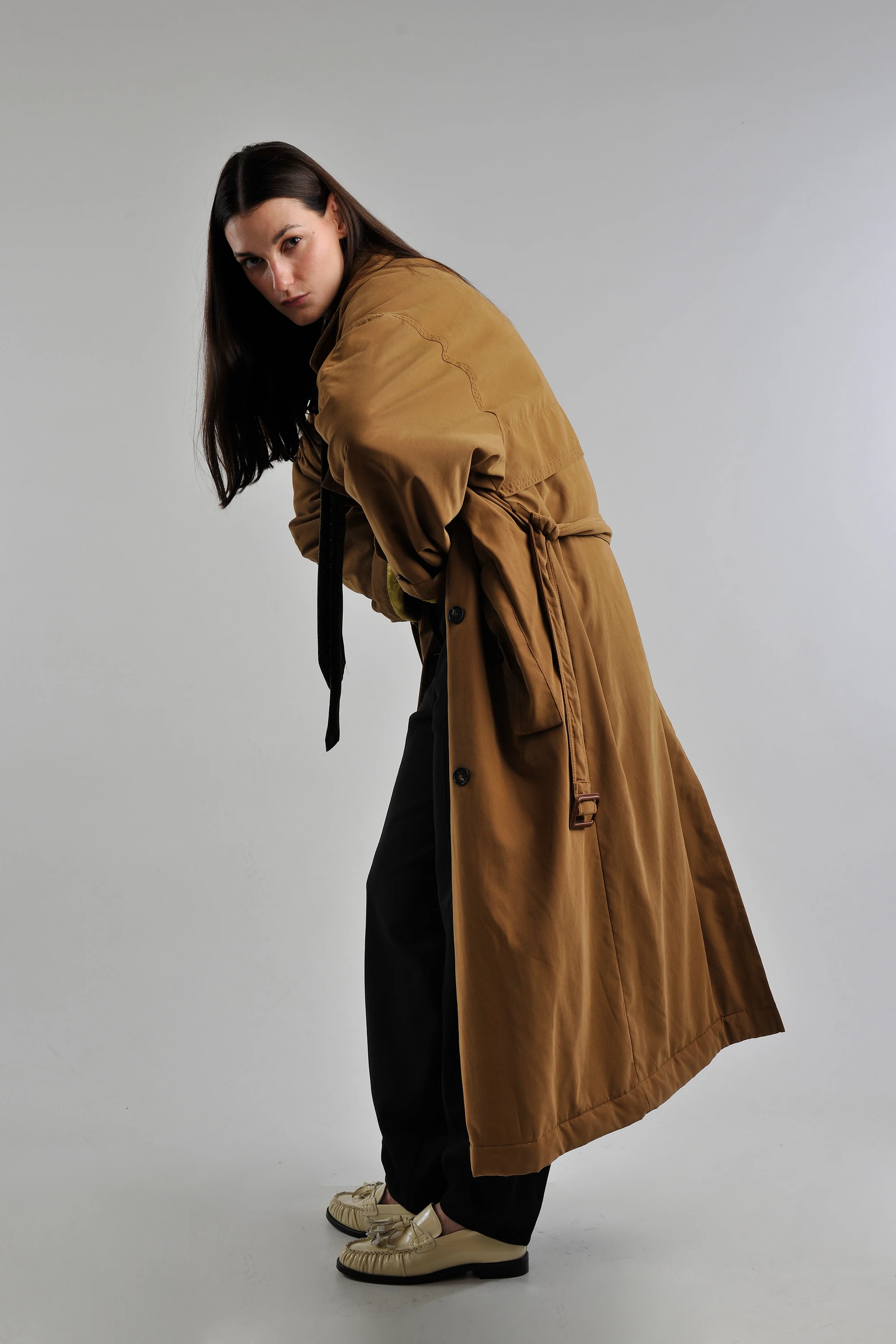 The oversized TELA 'Zenigata' trench coat defines the silhouette, offering a fluid yet commanding structure.