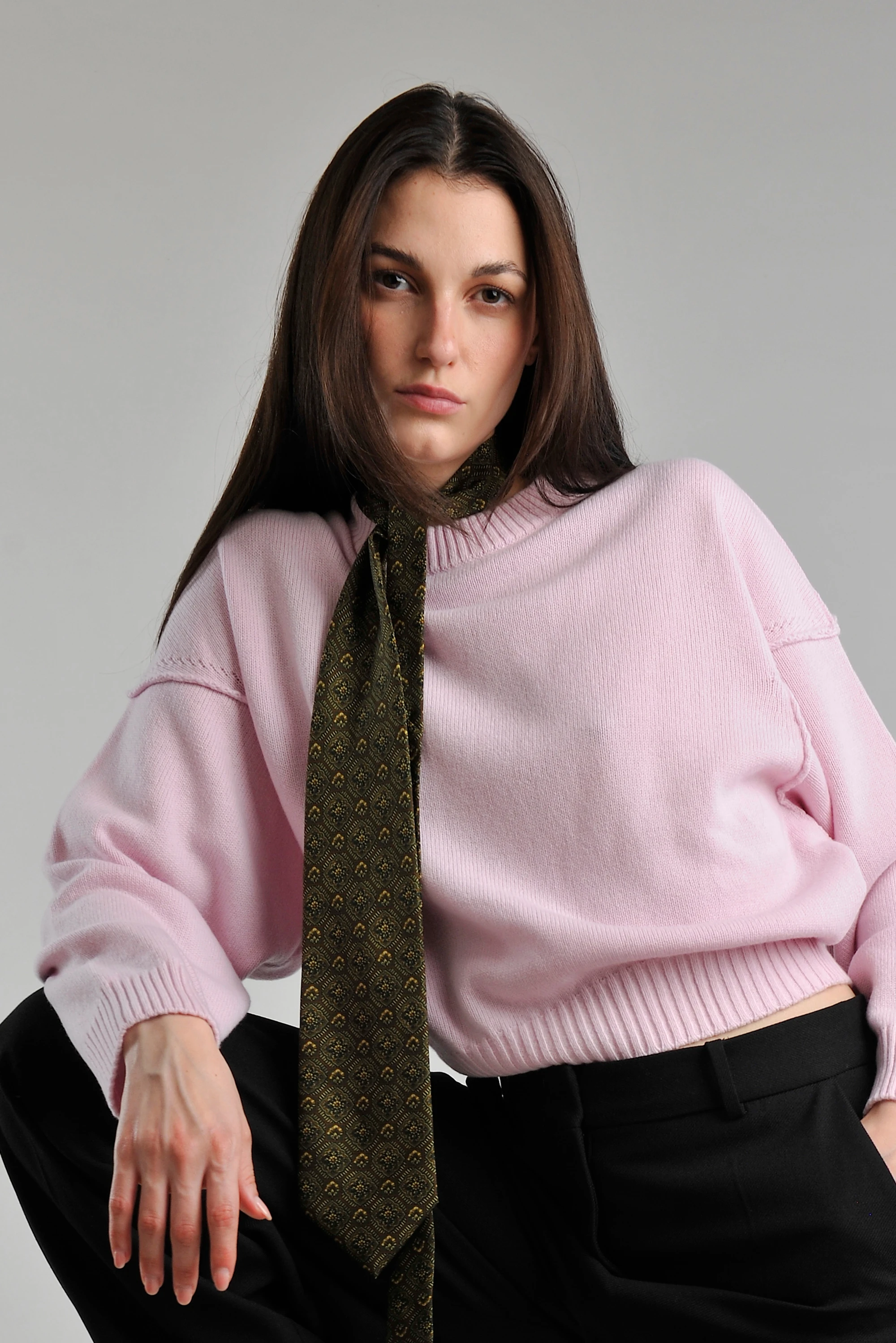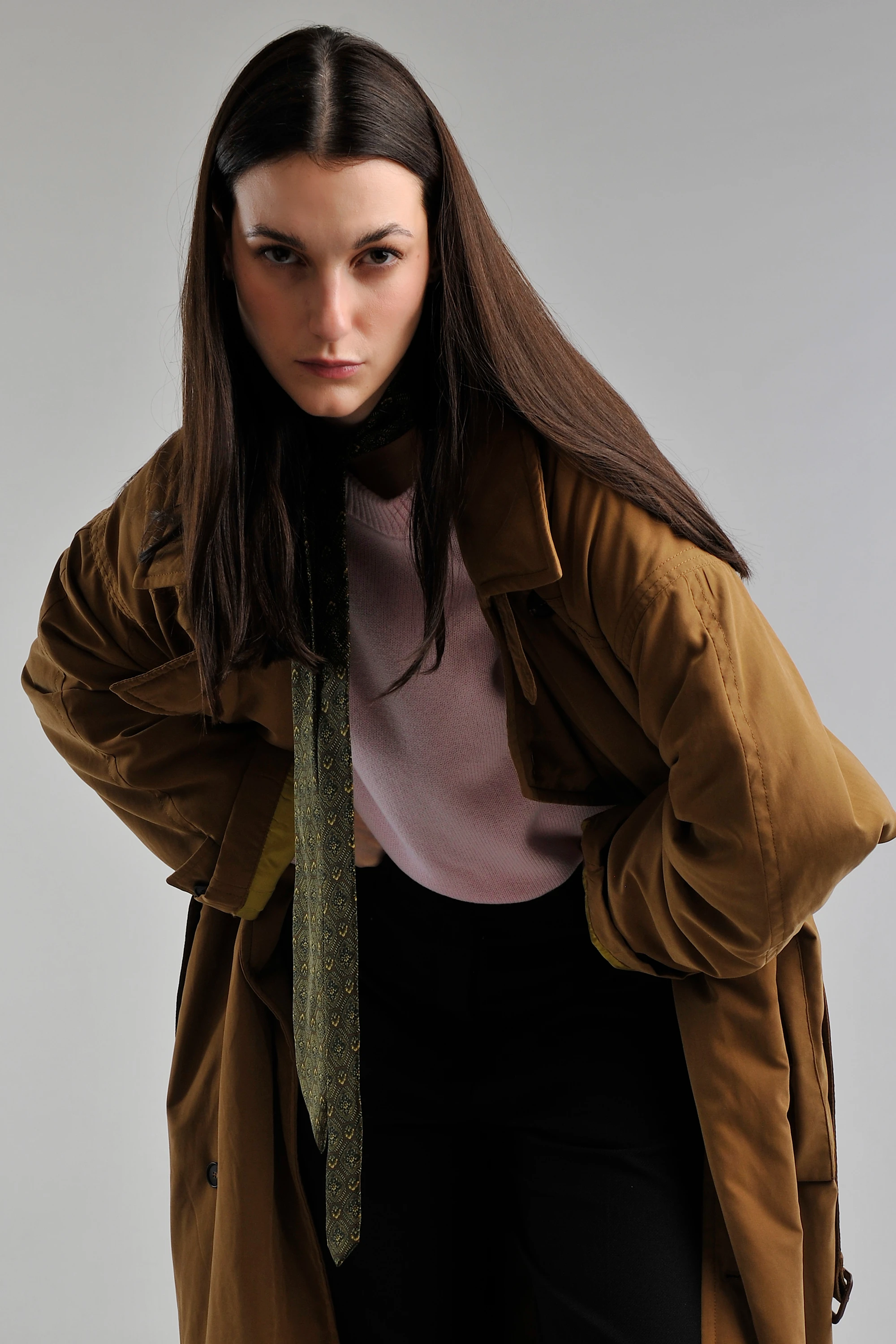Beneath, a soft TELA sweater is layered with a VINTAGE tie, injecting a playful, intellectual edge into the ensemble.