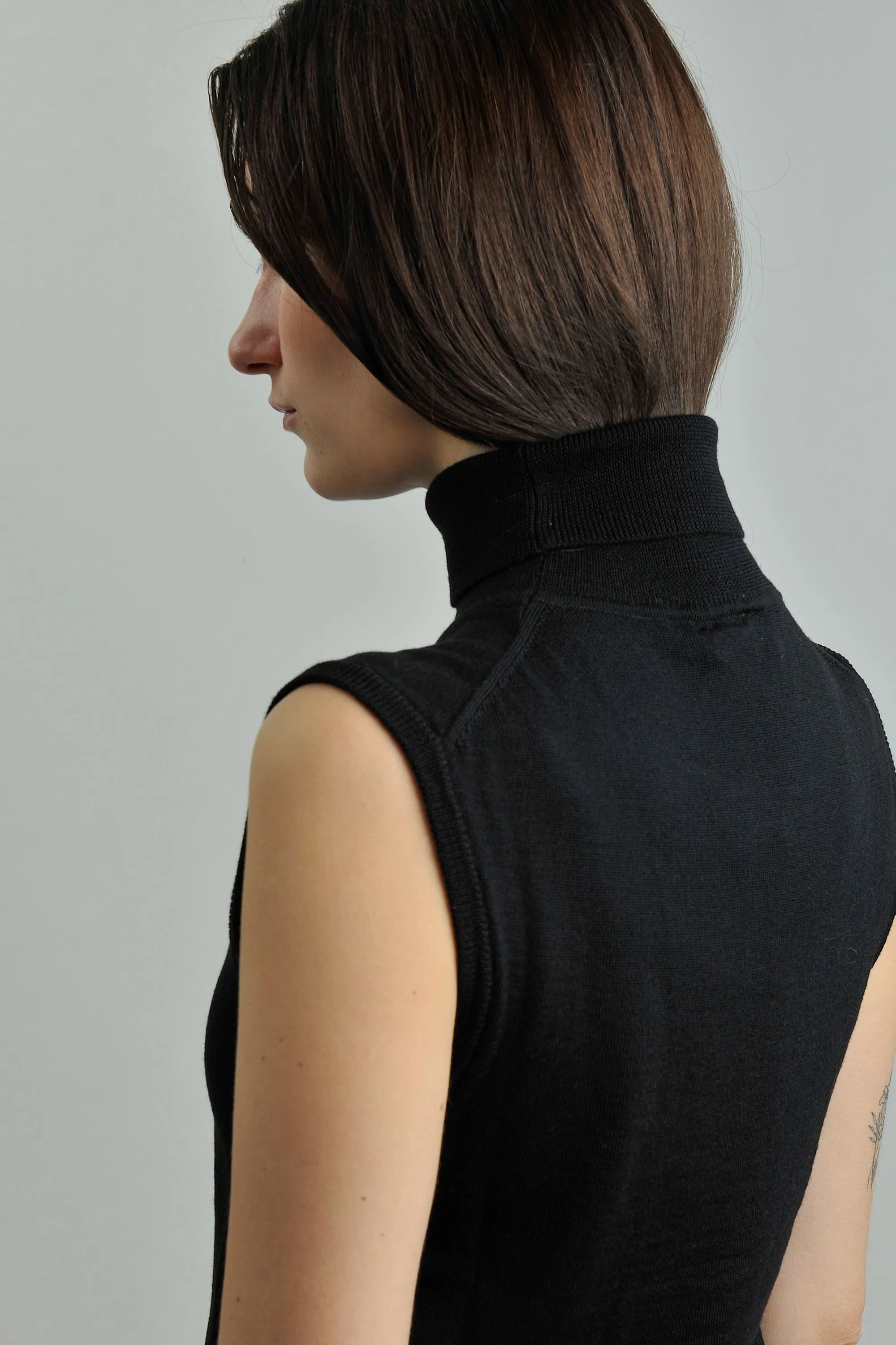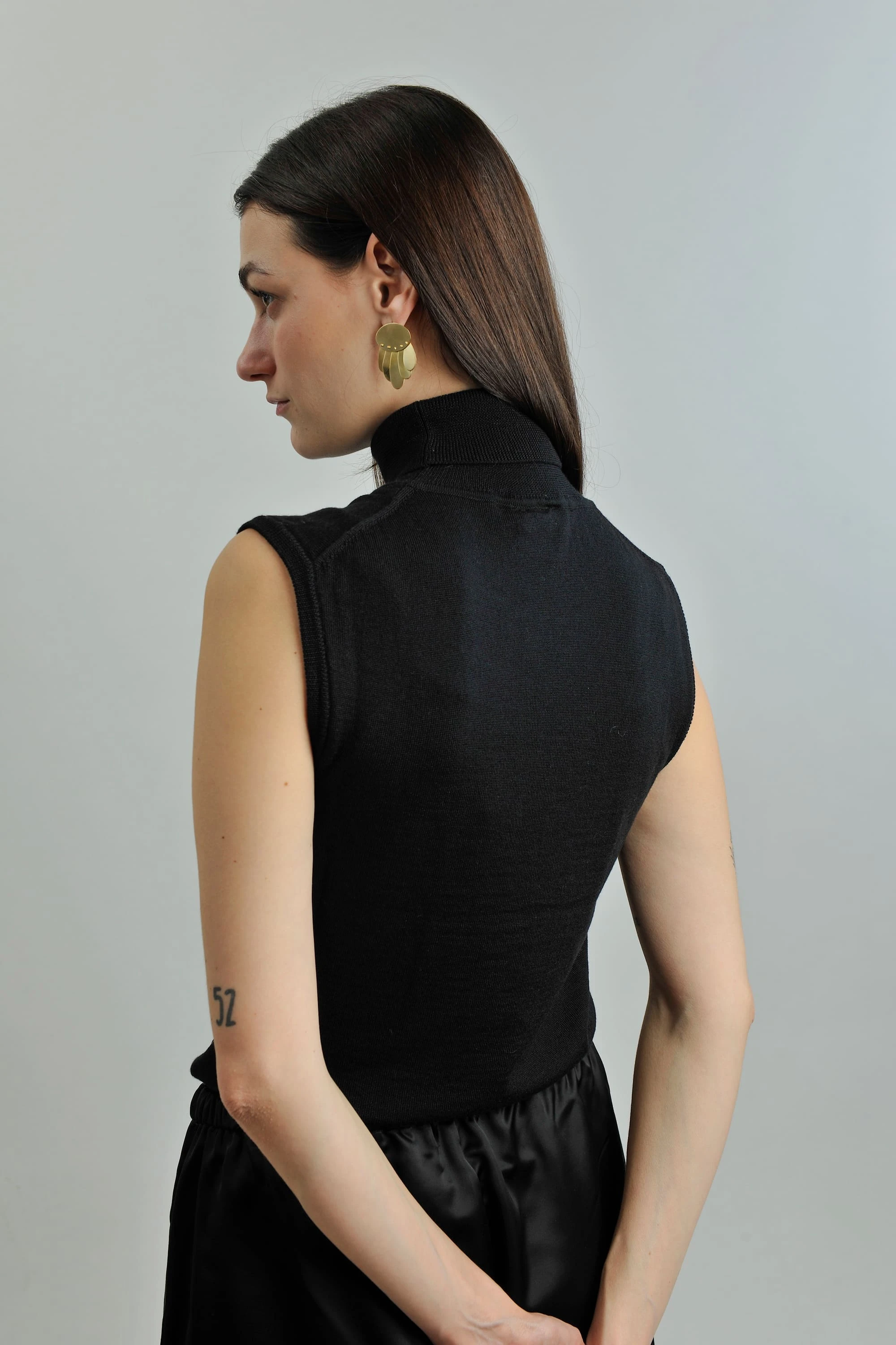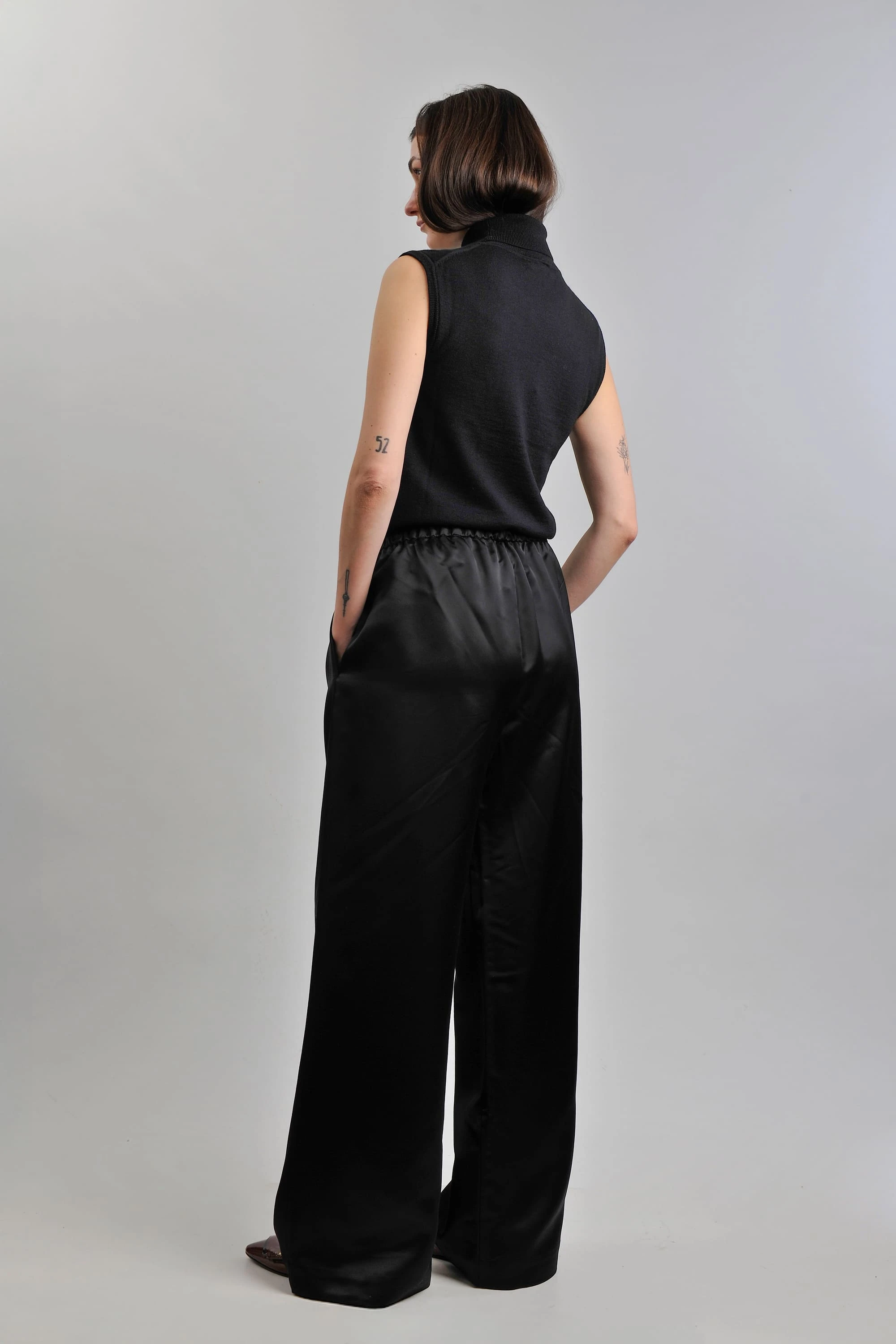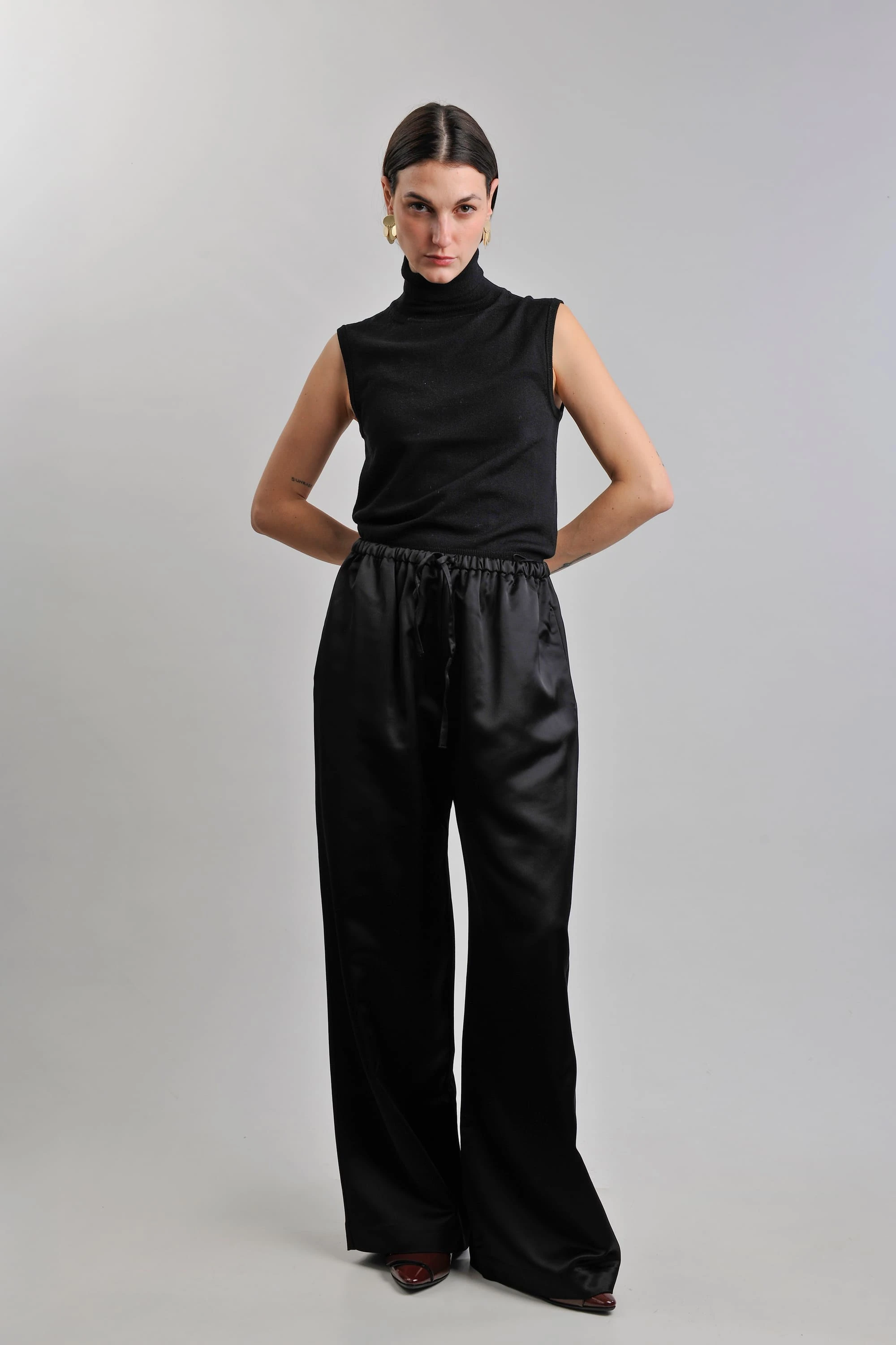 The sleeveless FILIPPA K turtleneck provides a sharp, structured line, beautifully contrasted by the wide-leg, technical CORDERA trousers, whose silky drape redefines luxurious ease.