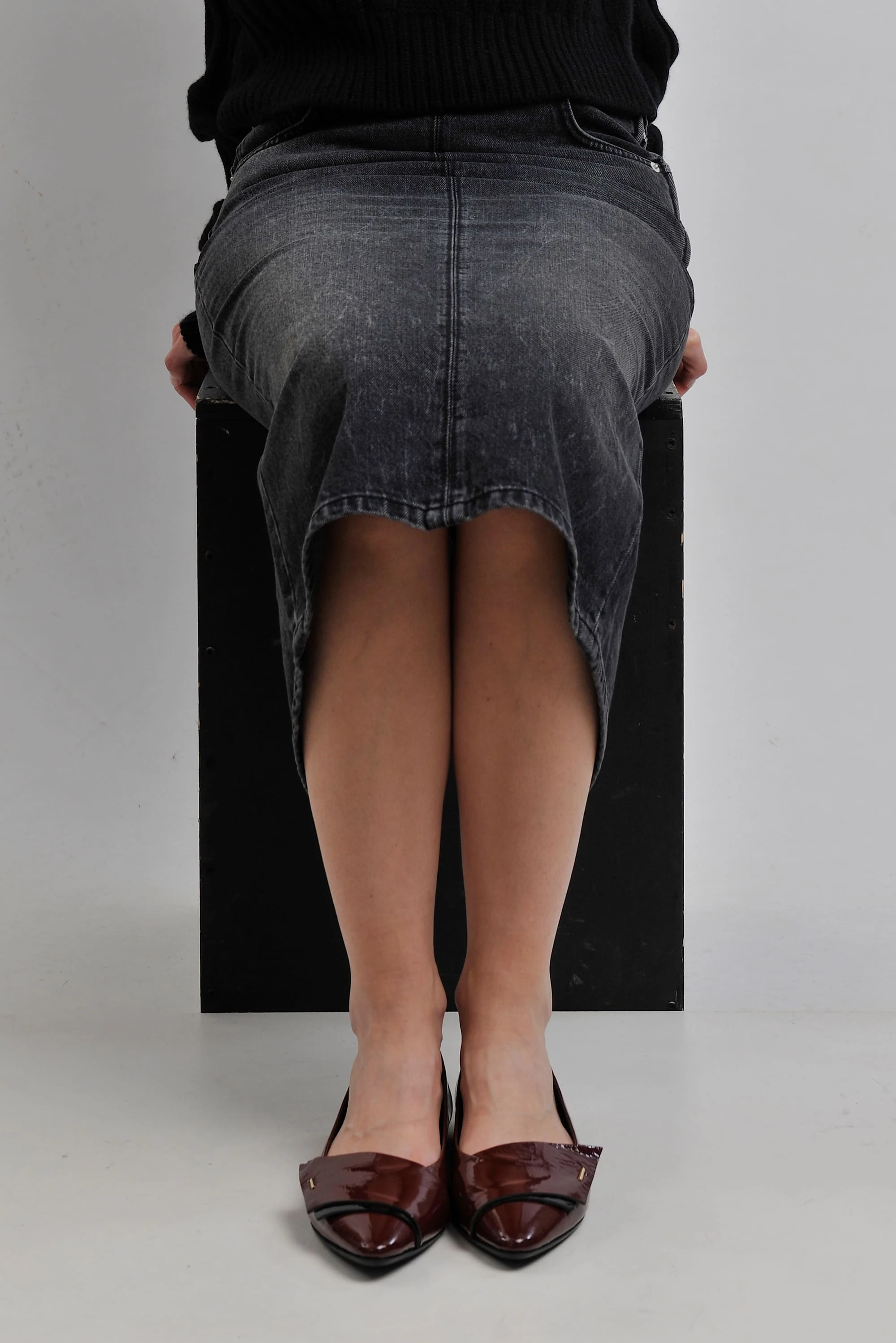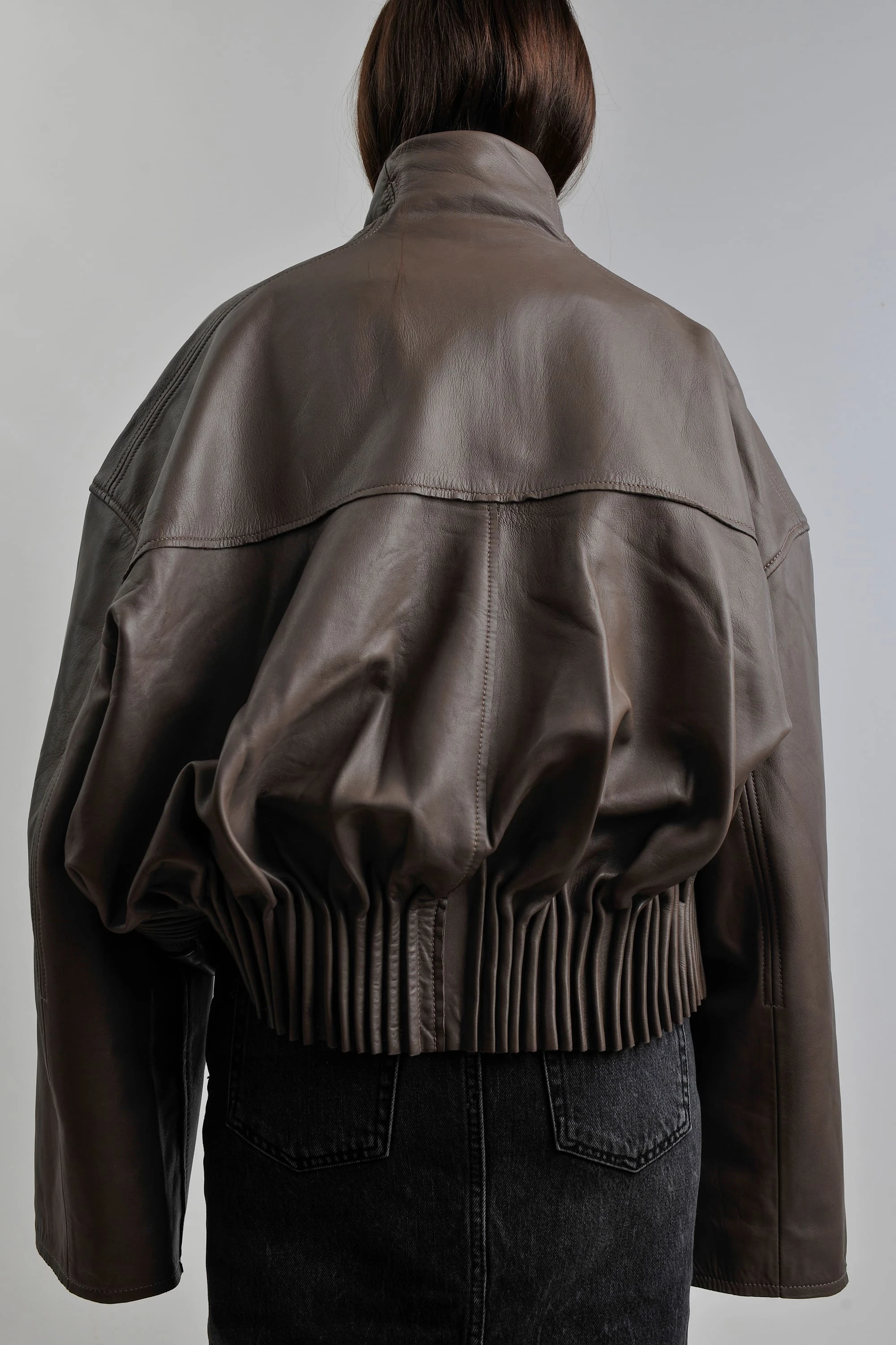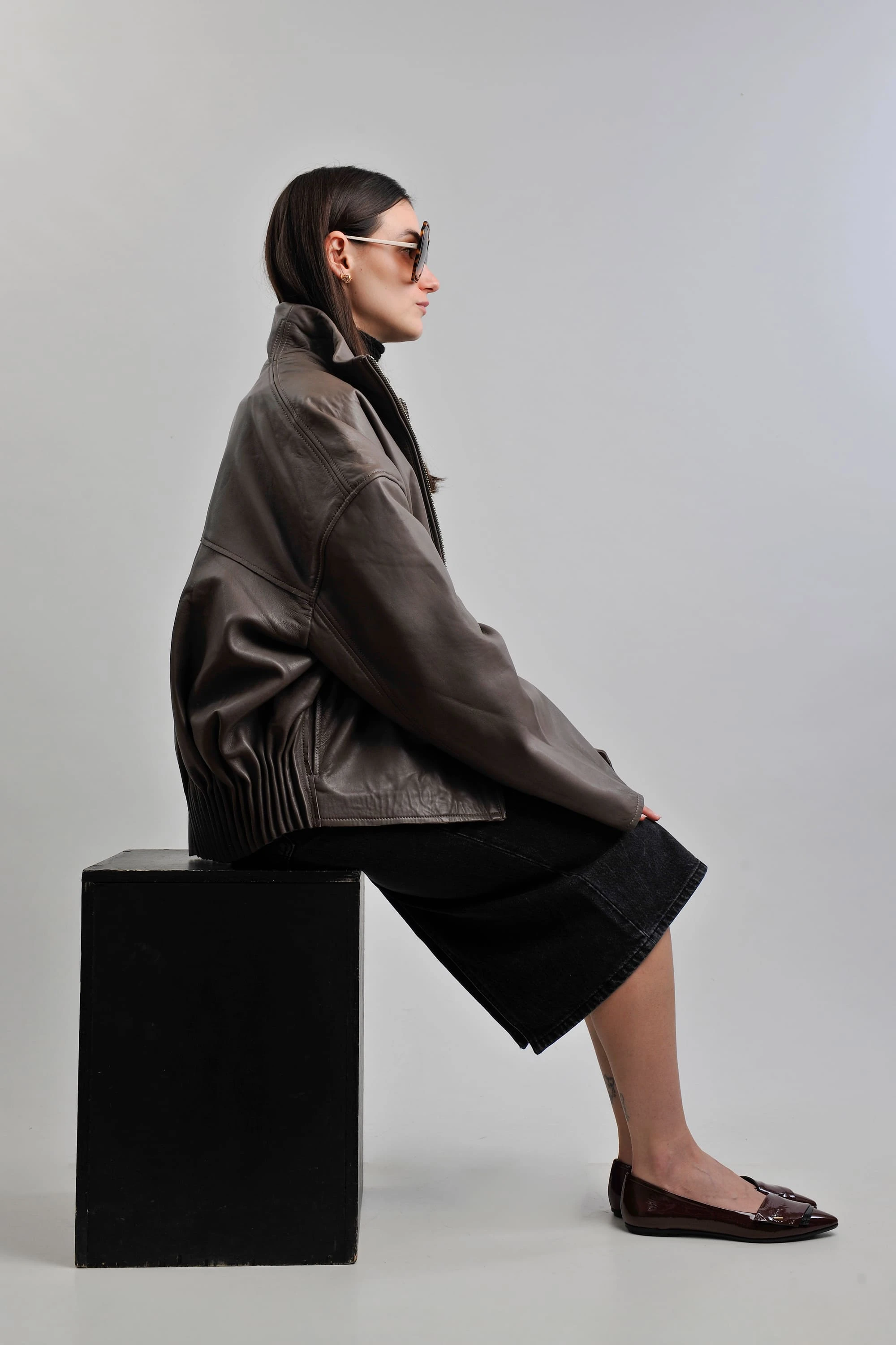 The oversized REMAIN leather jacket makes a striking statement, its smooth texture contrasting beautifully with the sturdy feel of the HAIKURE denim skirt.