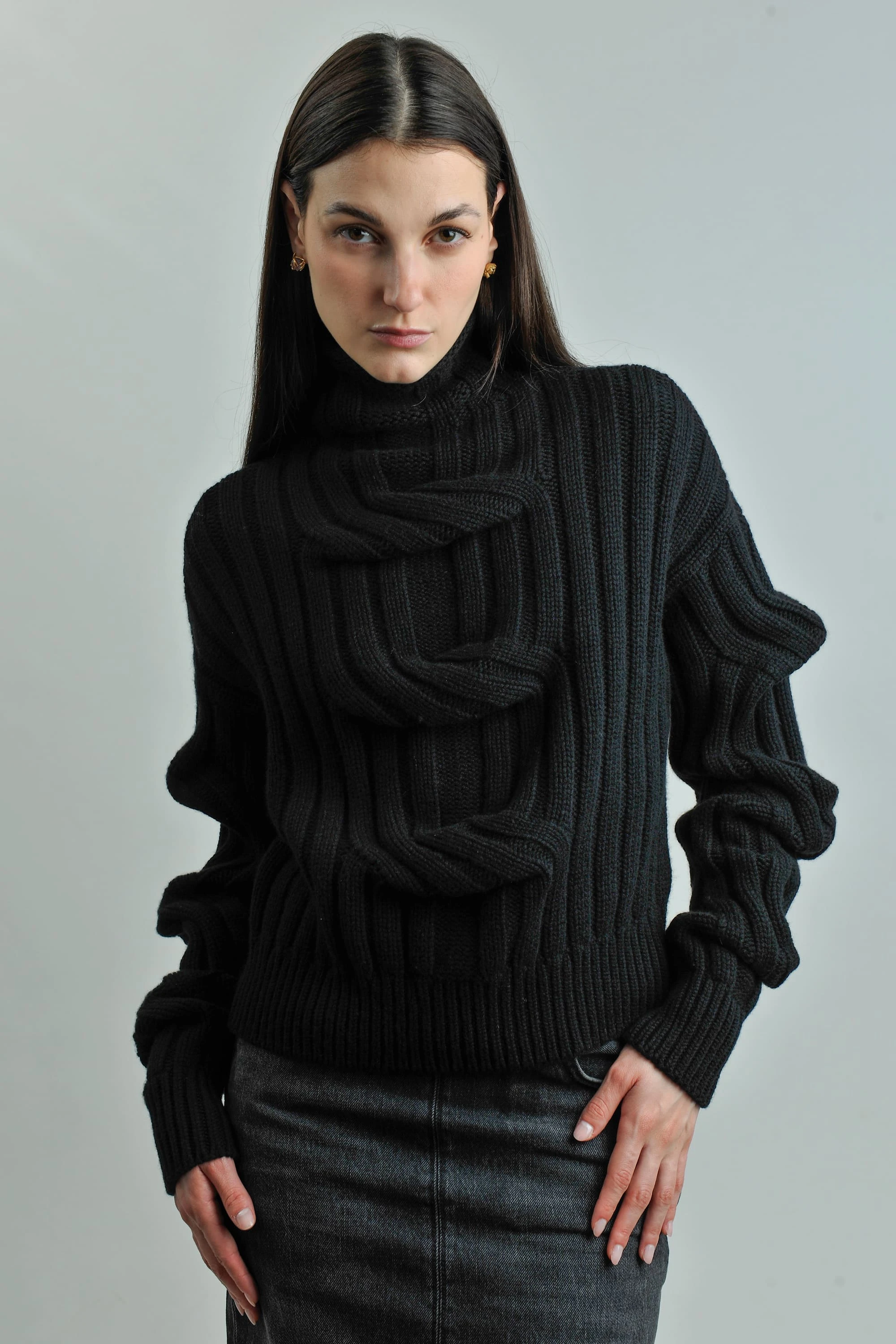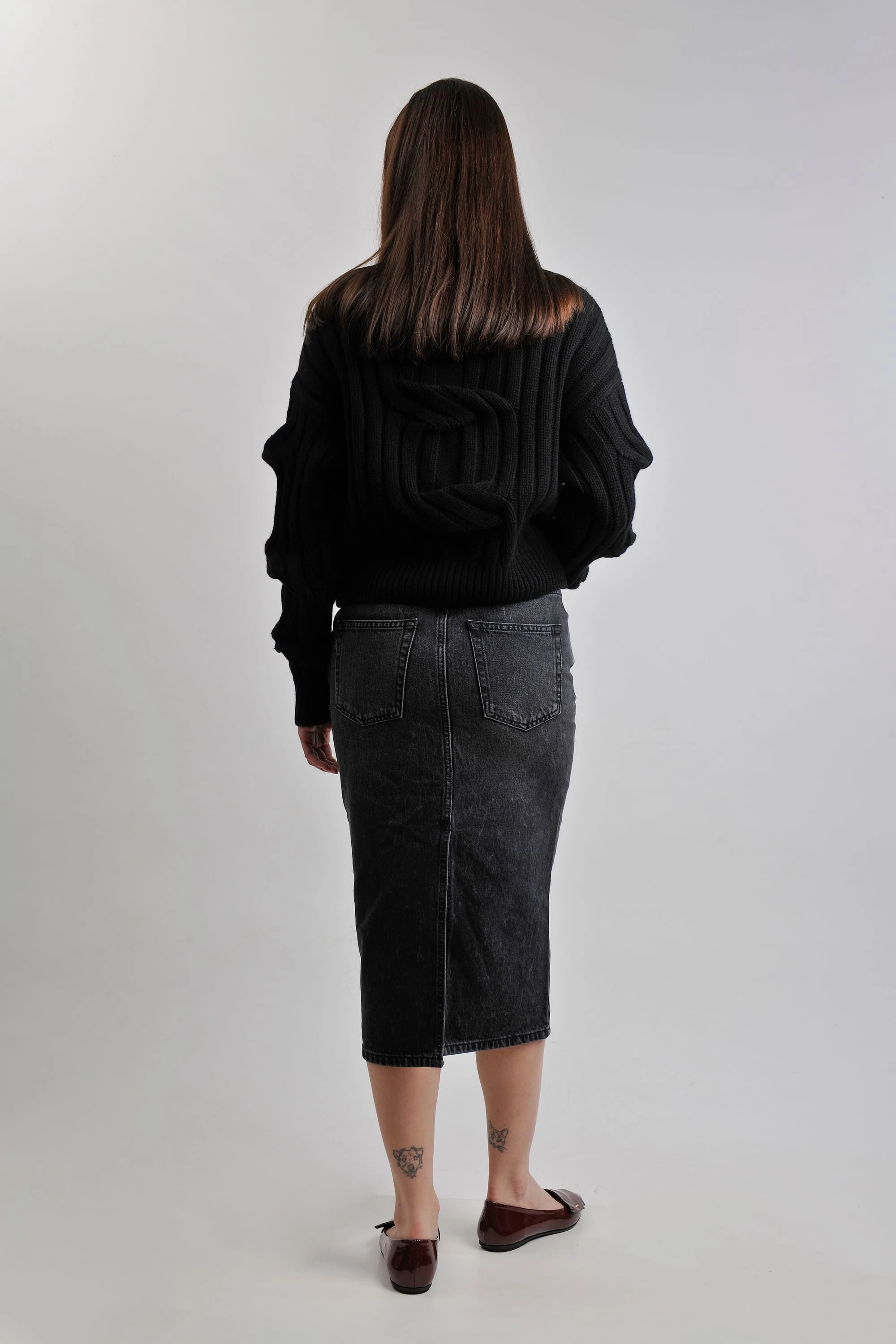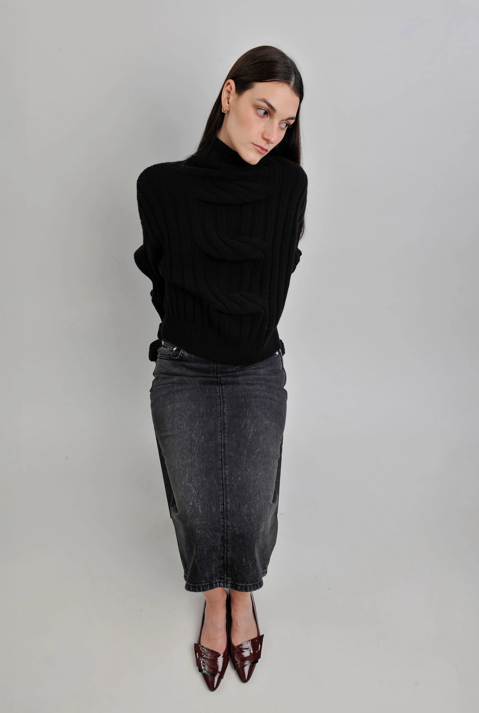 A soft MRZ sweater completes the refined base. The ensemble is anchored by the sharp, polished finish of DEL CARLO ballet flats, proving that quiet luxury is found in the powerful simplicity of well-chosen pieces.