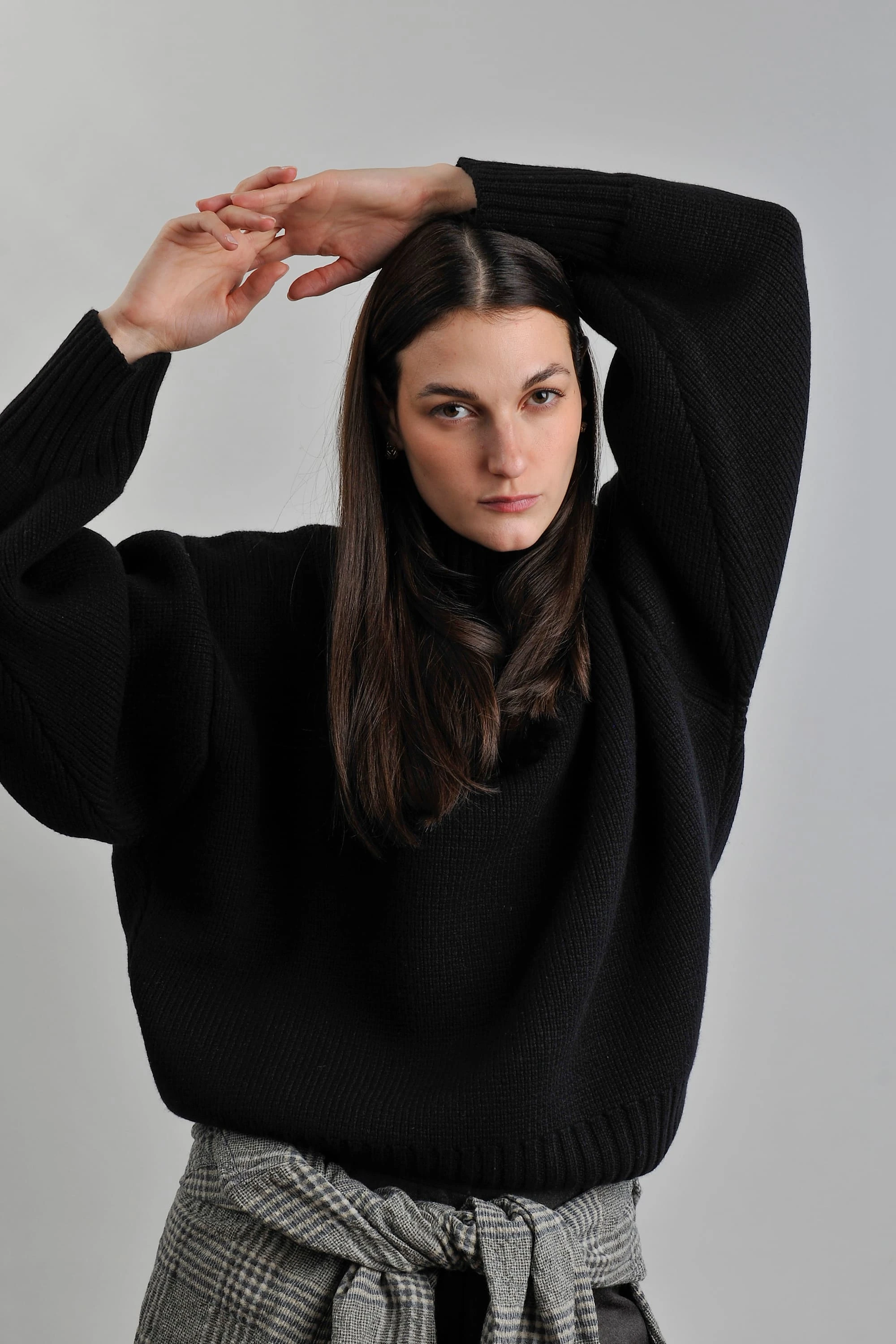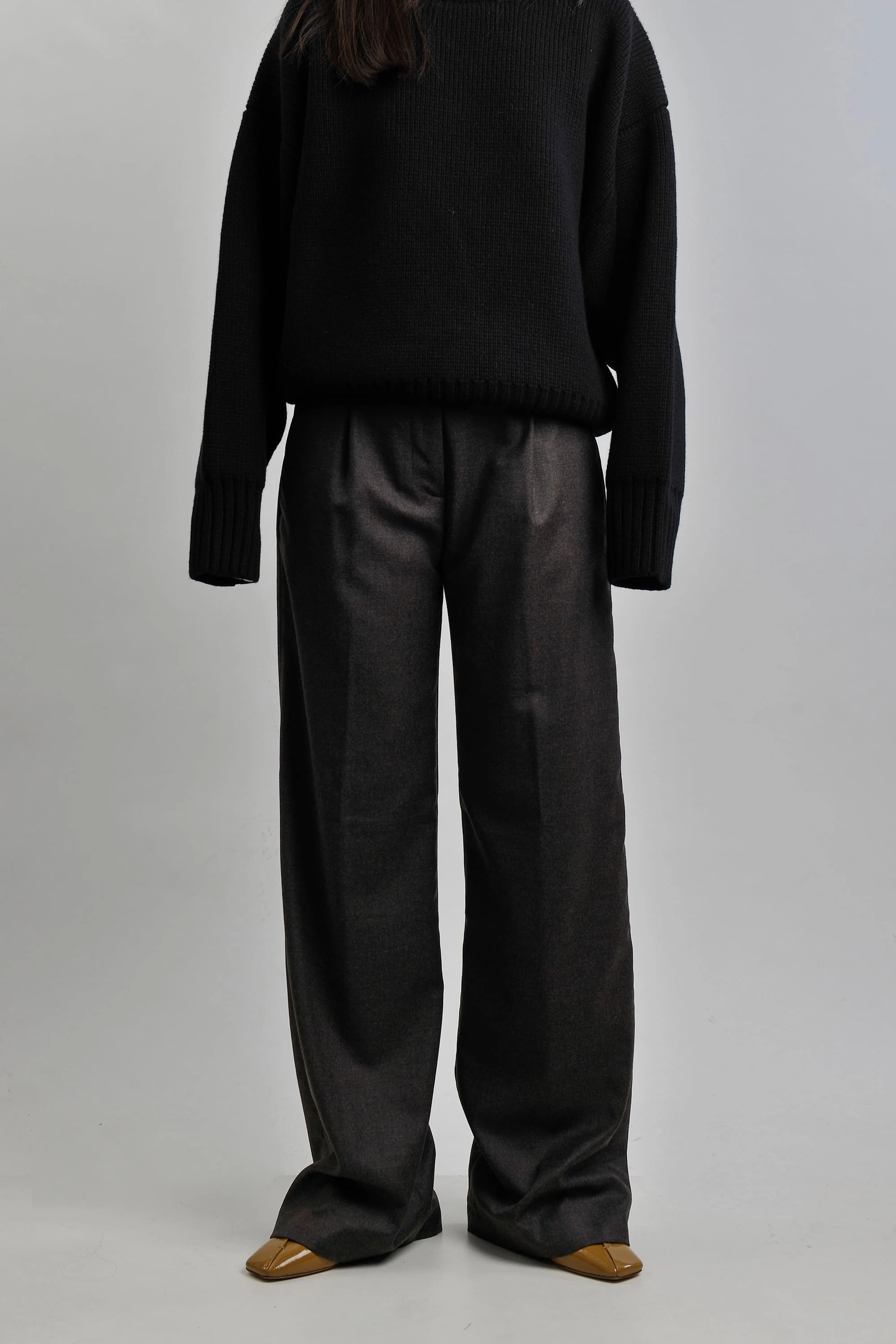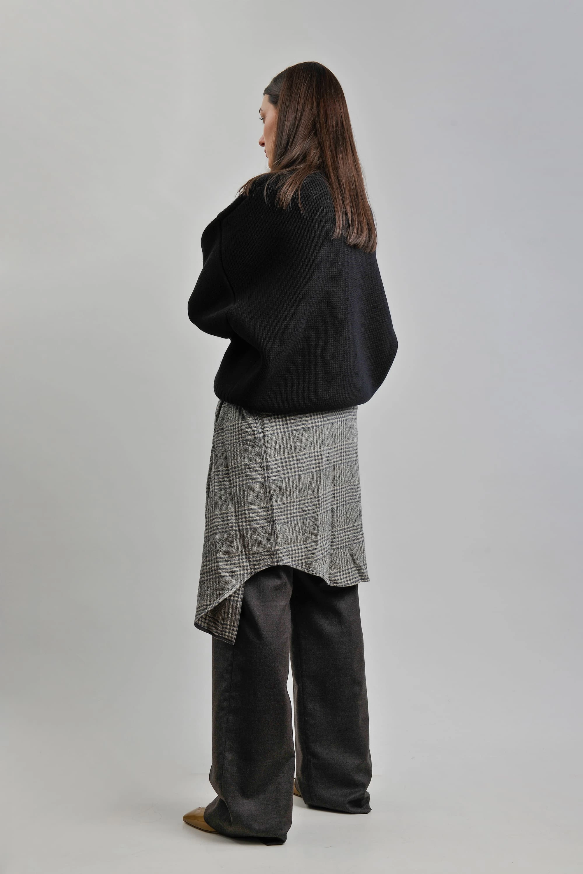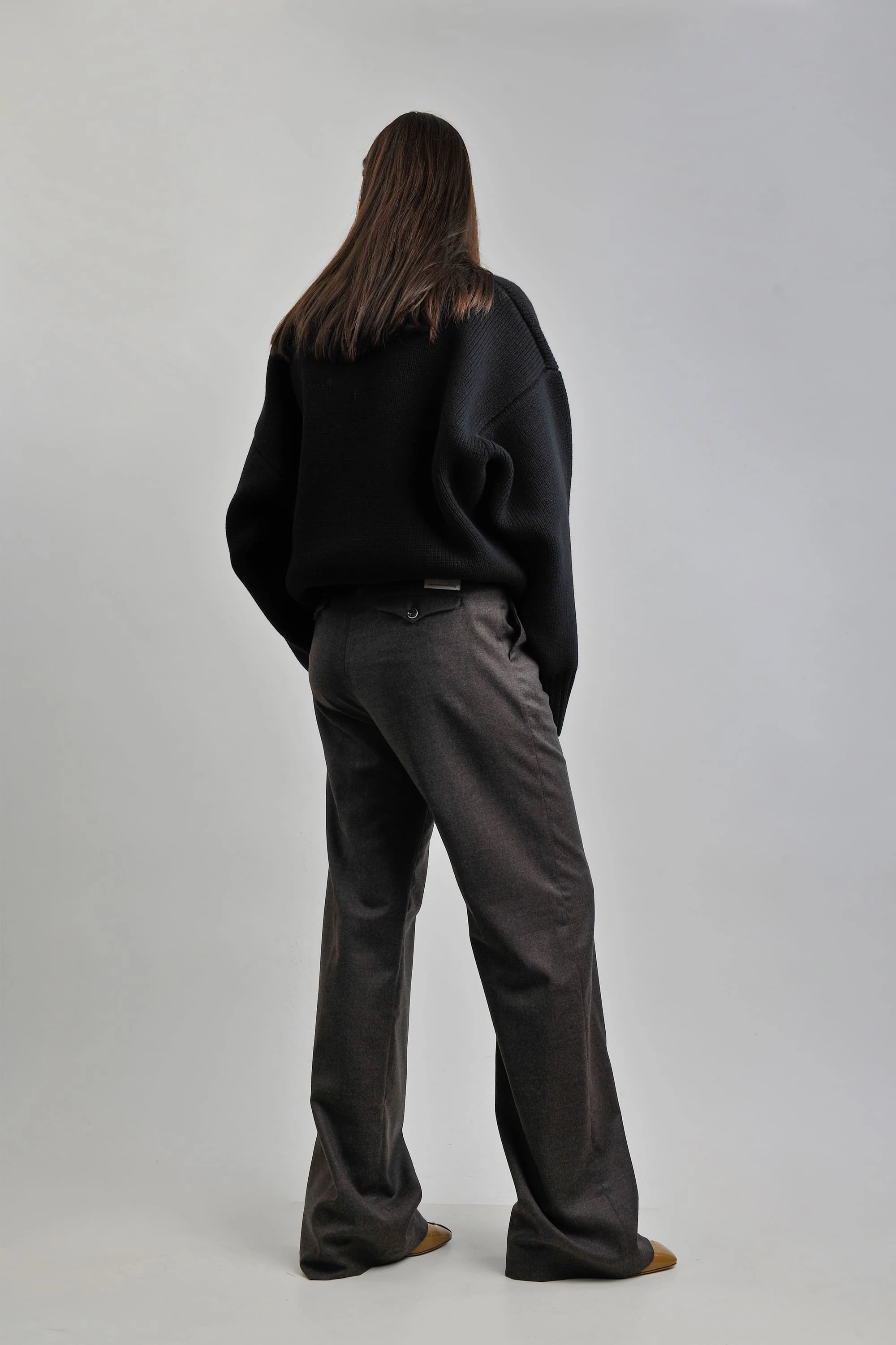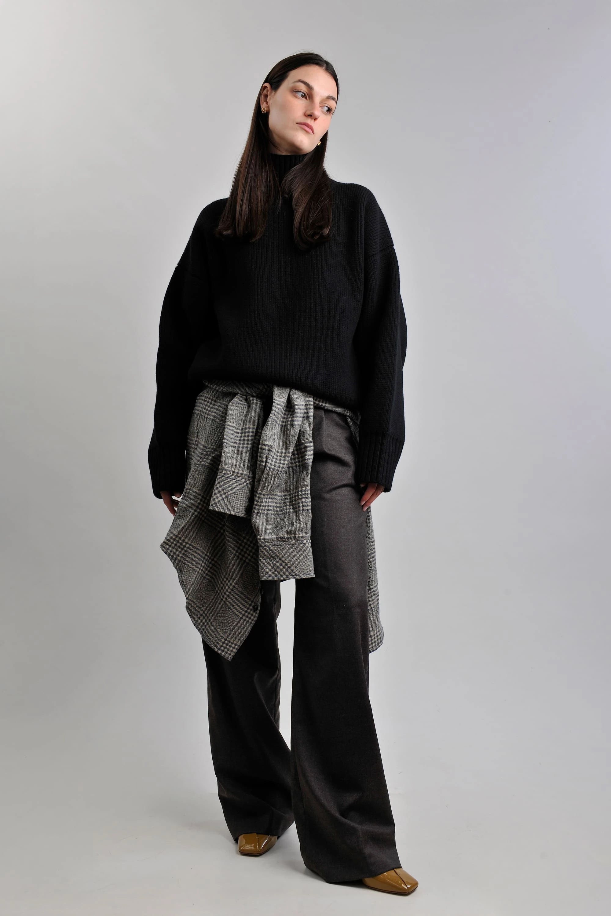 A voluminous ROHE sweater creates a commanding yet comfortable silhouette. The foundation is built upon classic NINE IN THE MORNING trousers, balanced by the deliberate, casual attitude of a LOW CLASSIC shirt tied at the waist.