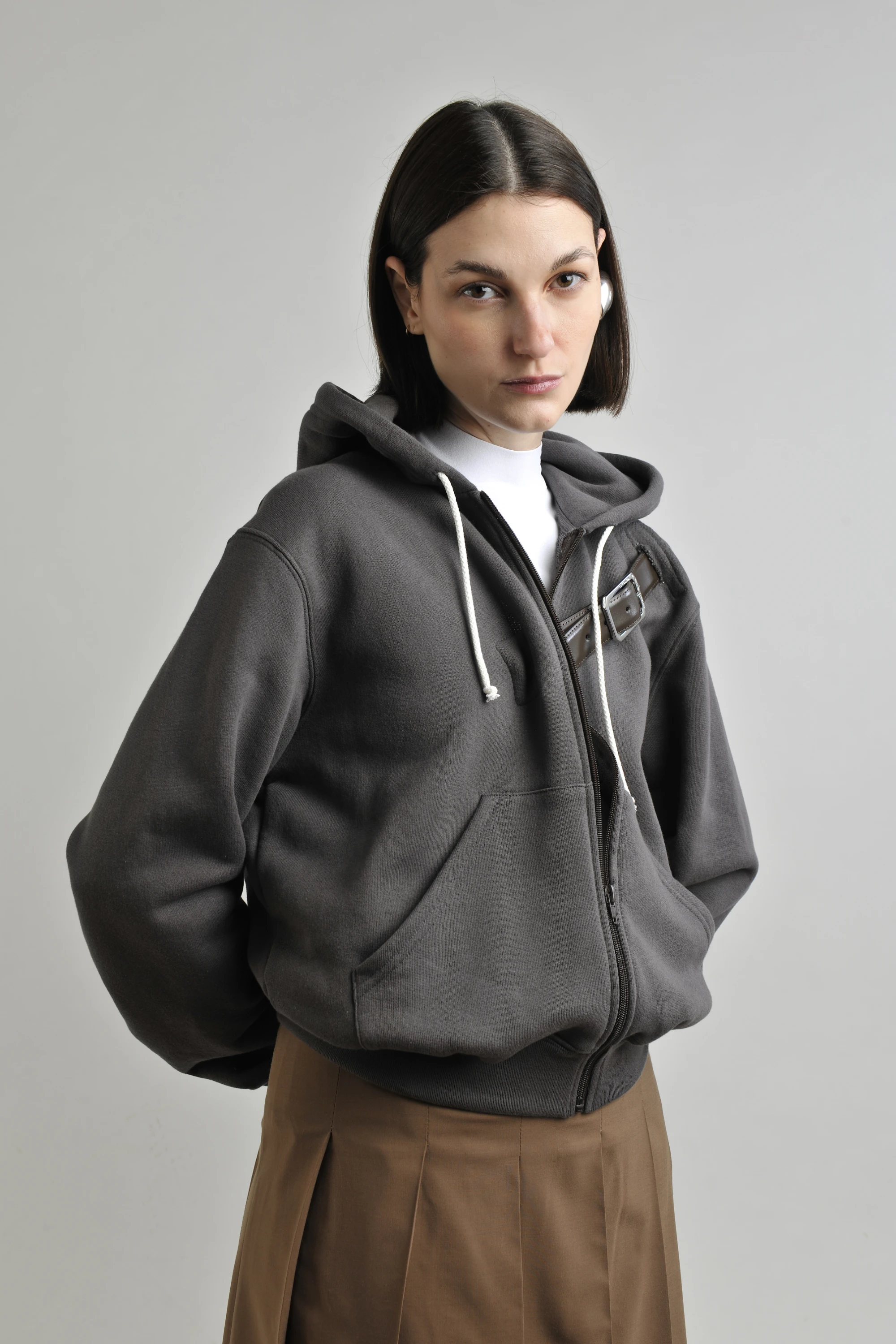 The MAGLIANO hoodie takes center stage, featuring a cropped, industrial cut and unexpected buckle detailing that injects a sense of utilitarian grit. This street-informed layer is artfully juxtaposed with the crisp, architectural lines of the ROHE pleated skirt. Its elongated, fluid silhouette and rich tobacco hue provide a grounded, sophisticated counterpoint to the dense texture of the jersey.