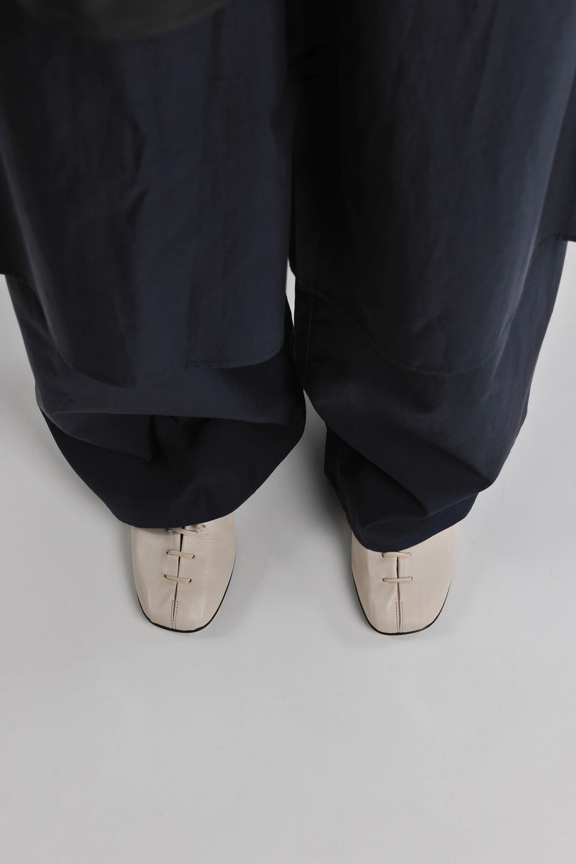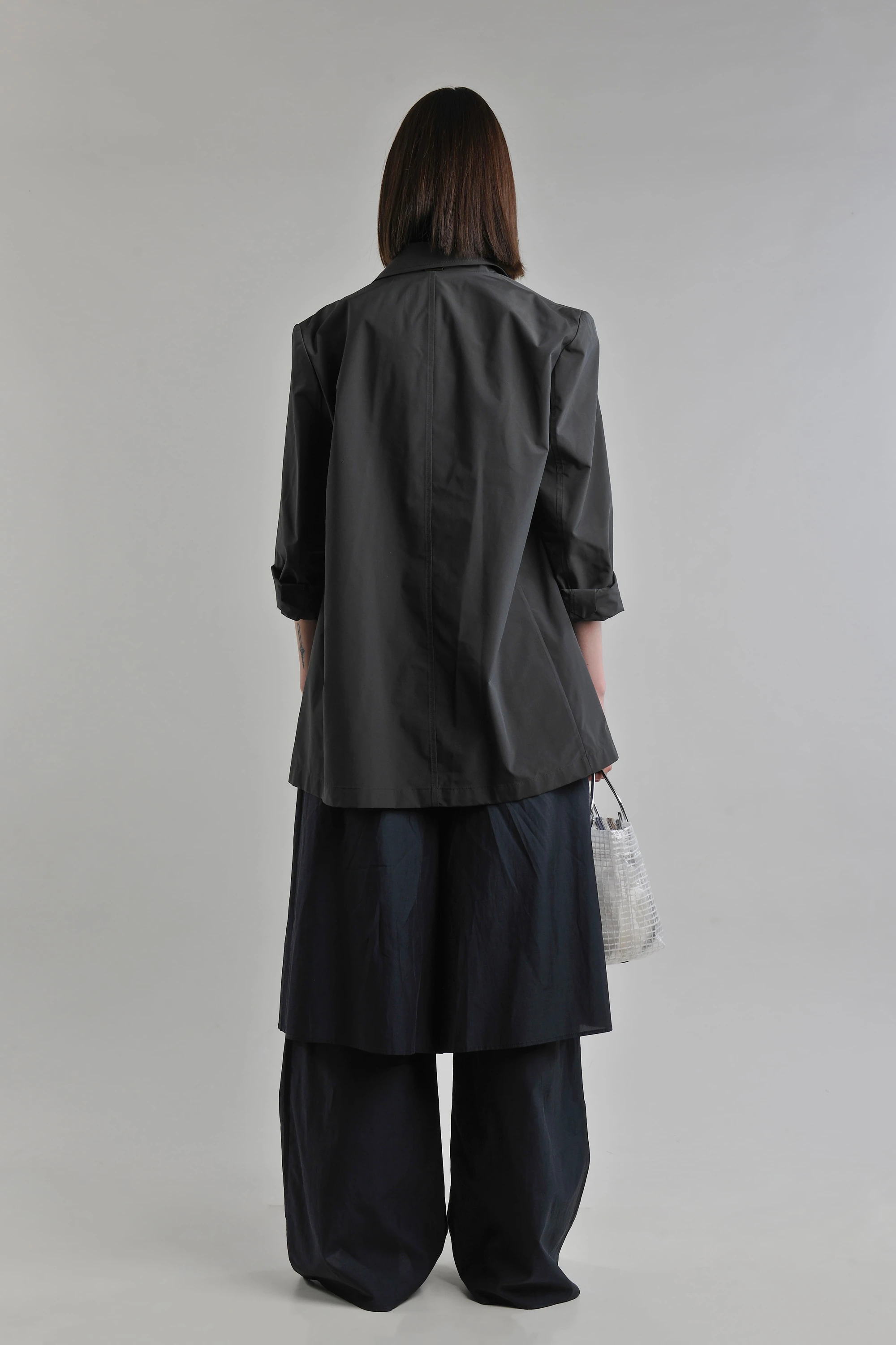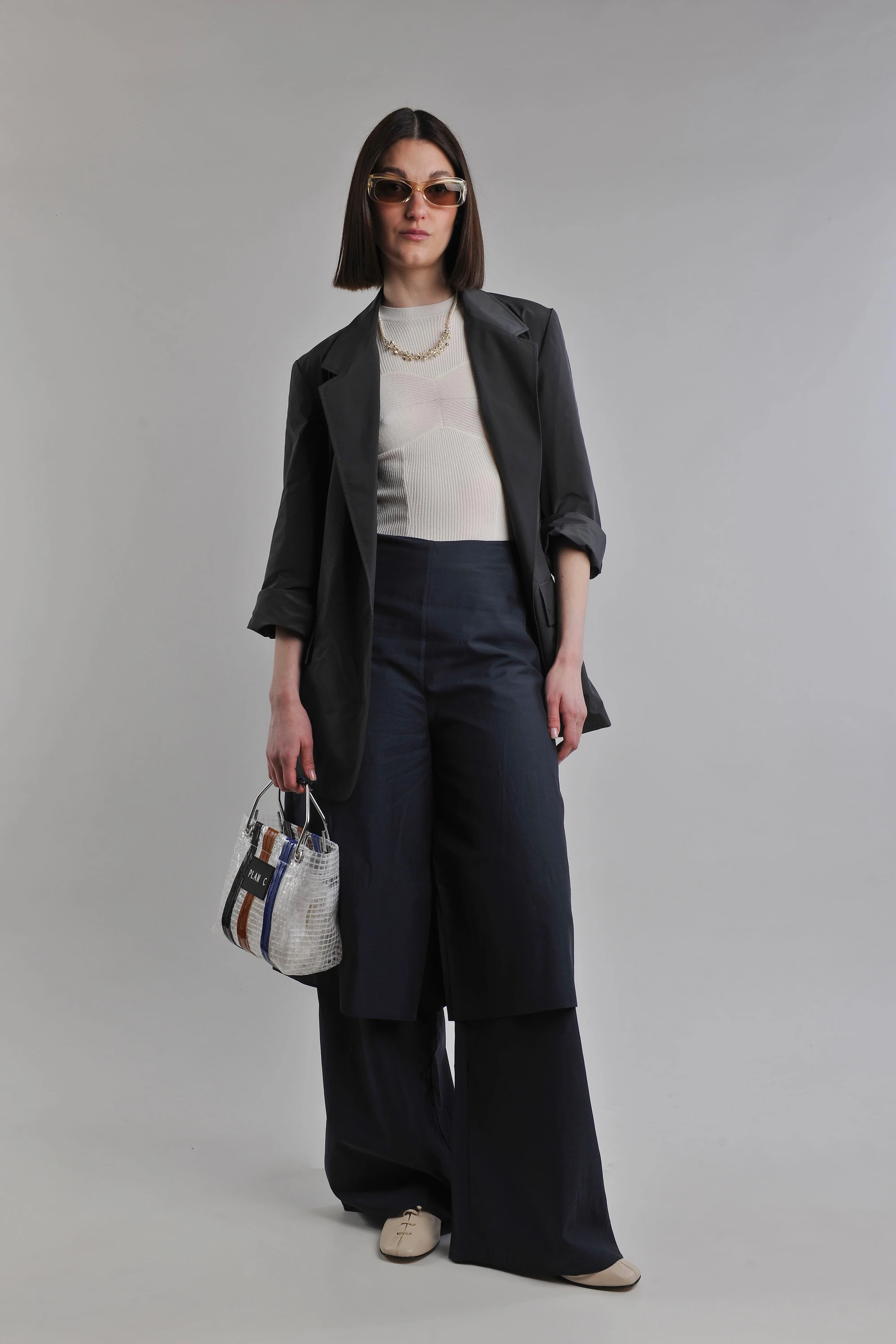 The SYSTEM jacket, worn with an intentional off-the-shoulder drape, anchors the silhouette with its sharp, utilitarian lines and technical fabric. Beneath, a knitted HAIKURE tank top introduces a soft, ribbed texture that provides a subtle, tonal contrast. This play of light and shadow is further elevated by the RUOHAN trousers, their expansive, fluid cut creating a powerful sense of architectural movement.