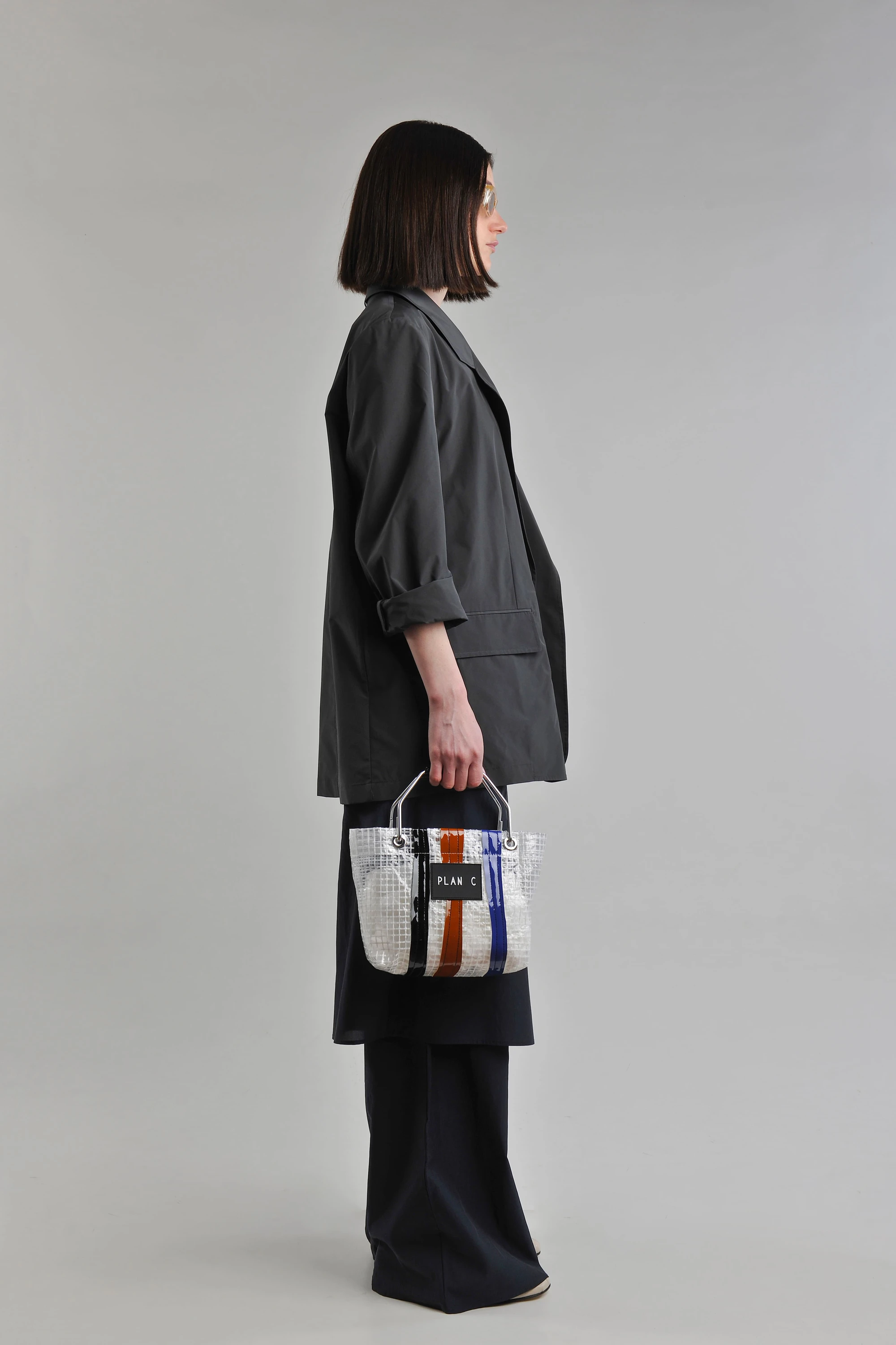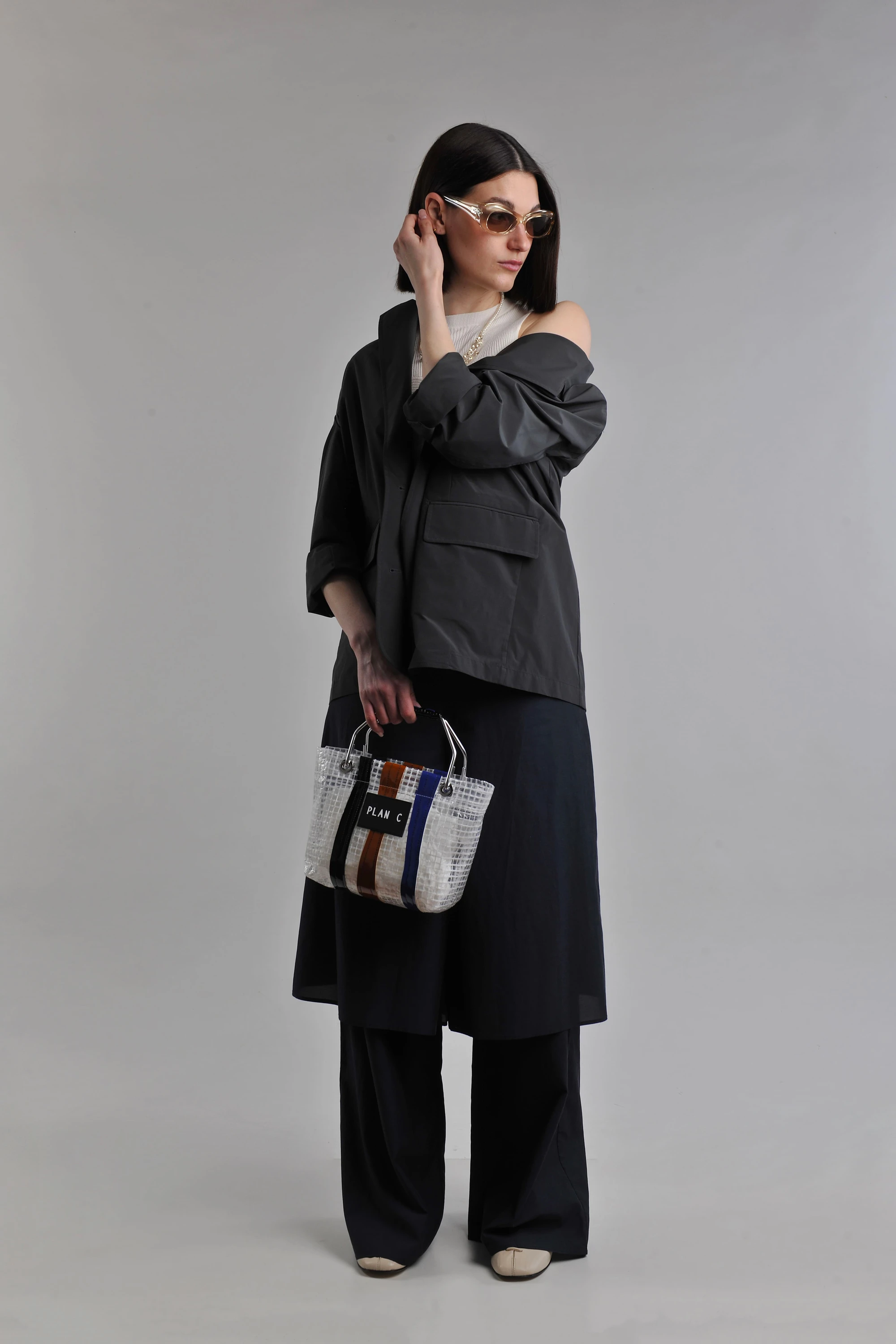 The look is punctuated by artisanal accents: a delicate RITA MARTINEZ necklace adds a fine, golden line of light, while the PLAN C striped tote bag introduces a graphic, multi-chromatic rhythm.