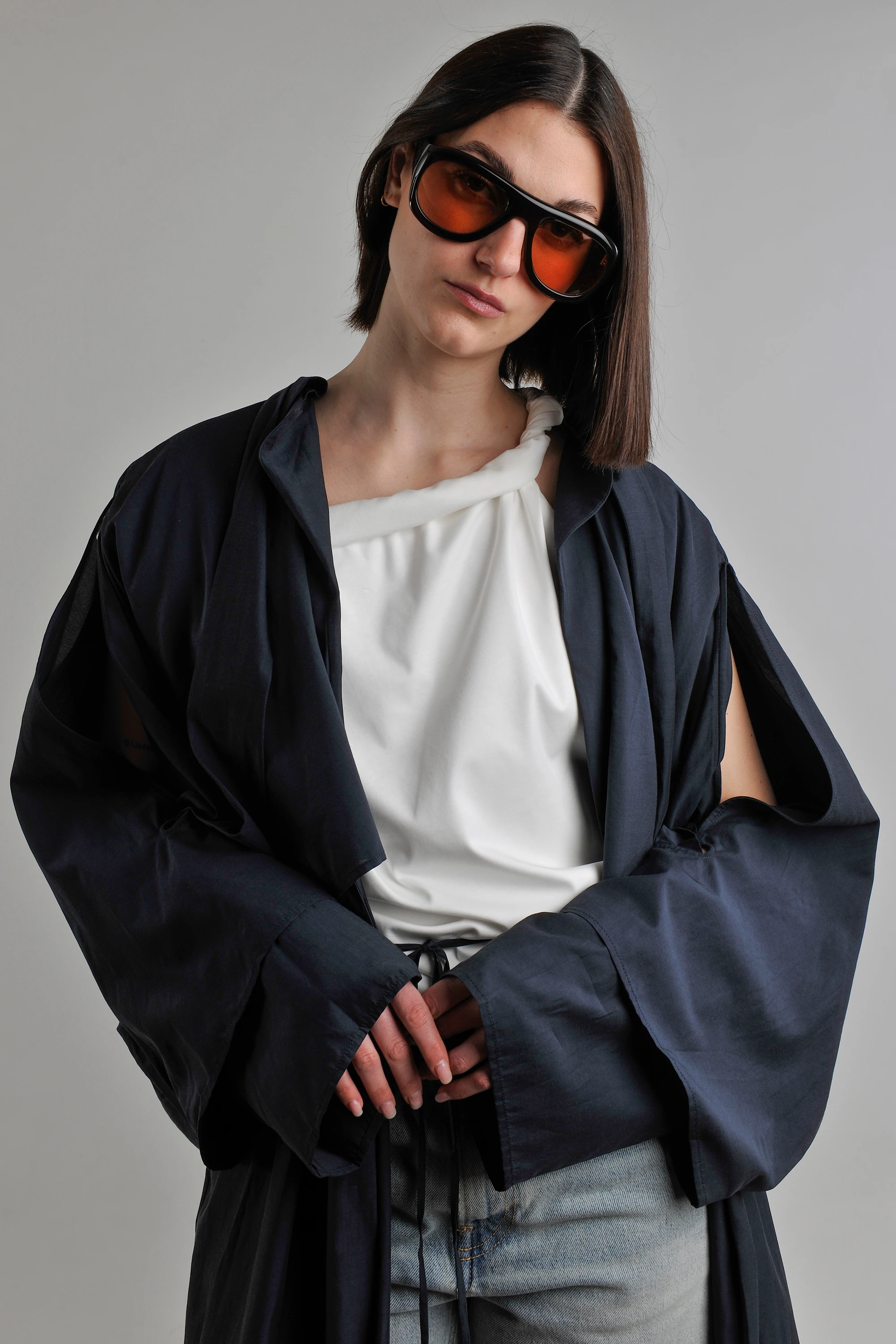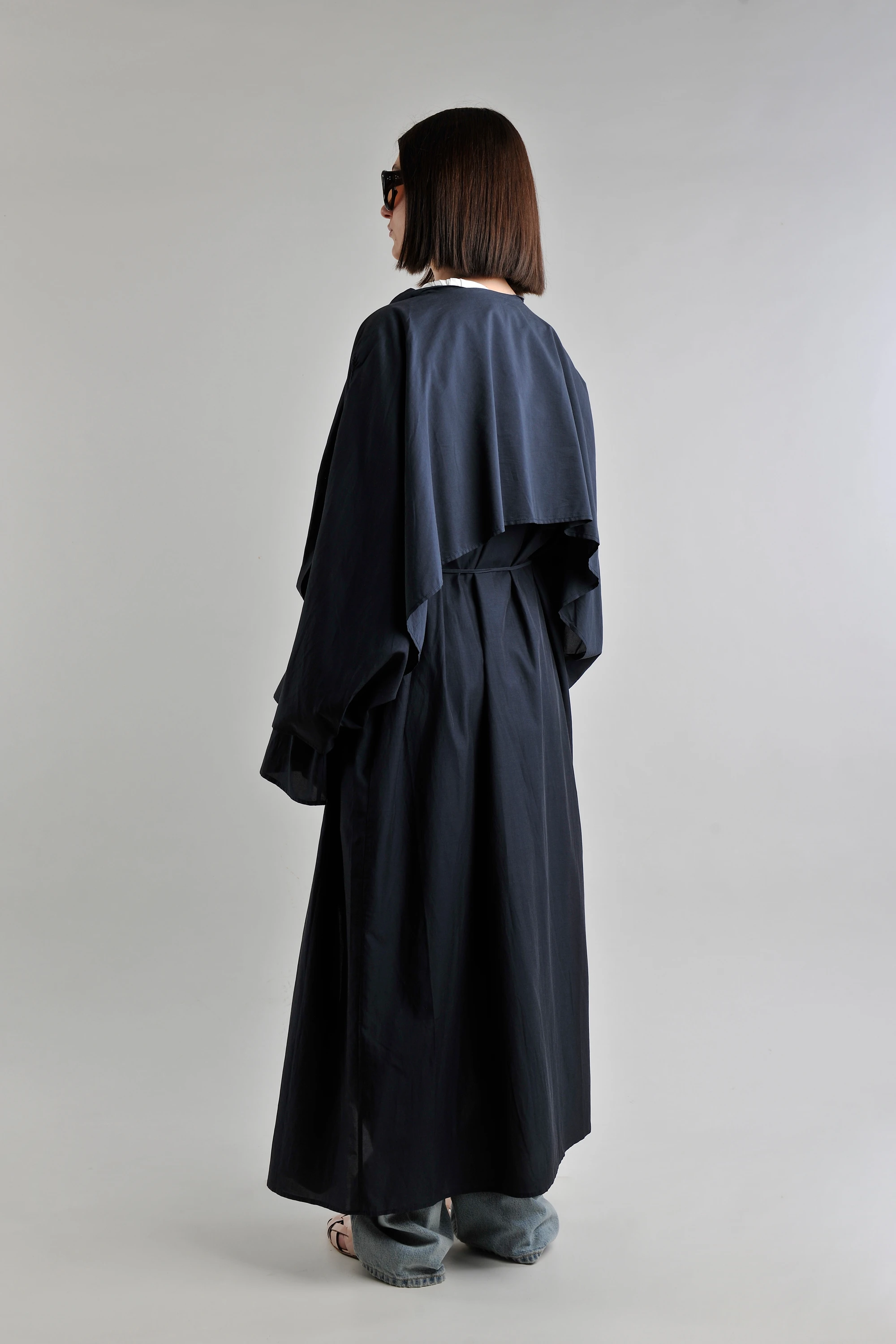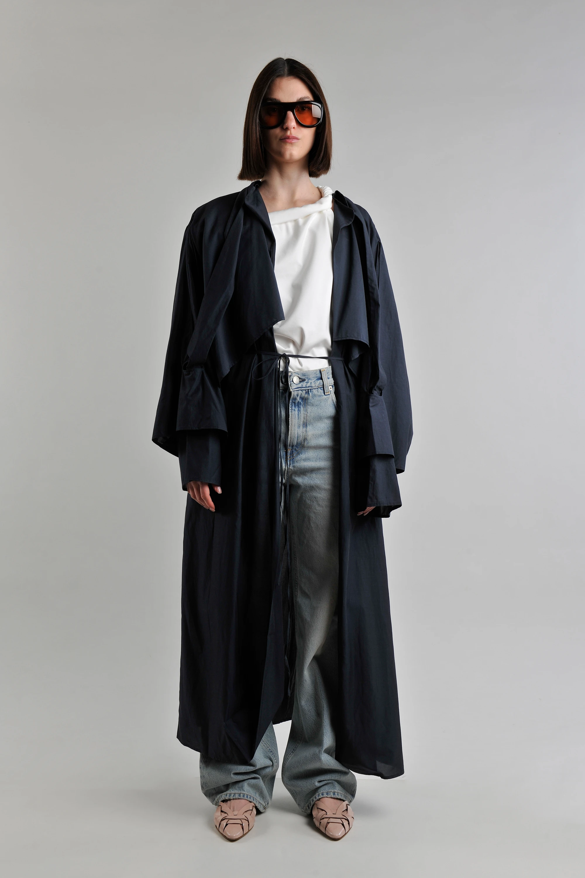 The RUOHAN trench coat takes center stage, featuring a lightweight, technical drape and an expansive, floor-sweeping silhouette. Its fluid structure—defined by oversized sleeves and a delicate waist tie—creates a powerful sense of motion and enigmatic depth. Beneath, the ROHE top introduces a crisp, sculptural neckline that provides a minimalist, luminous contrast.